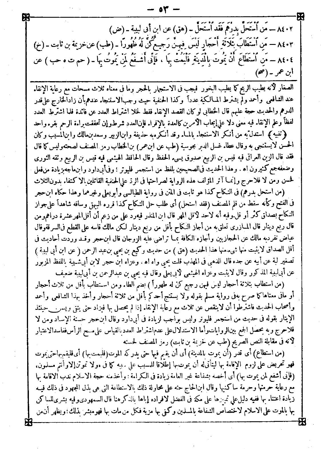 8403 - (من استطاب بثلاثة أحجار ليس فيهن رجيع كن له طهورا) بضم الطاء ومن استطاب بأقل من ثلاث أحجار أو ما في معناها كما صرح به في رواية مسلم بقوله ولا يستنج أحدكم بأقل من ثلاثة أحجار وأخذ بهذا الشافعي وأحمد وأصحاب الحديث فاشترطوا أن لا ينقص عن ثلاث مع رعاية الإنقاء إذا لم يحصل بها فيزاد حتى ينقى ويسن حينئذ الإيتار بقوله في حديث من استجمر فليوتر وليس بواجب لزيادة في أبي داود وقال ابن حجر: حسنة الإسناد ومن لا فلا حرج وبه يحصل الجمع بين الروايات وأما الاستدلال على عدم اشتراط العدد بالقياس على مسح الرأس ففاسد الاعتبار لأنه في مقابلة النص الصريح