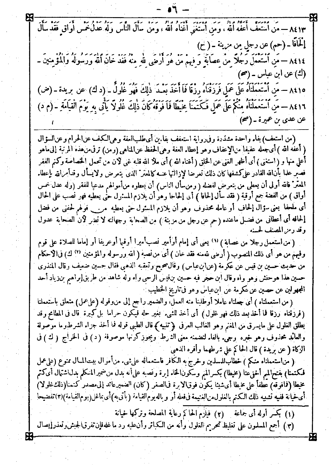8415 - (من استعملناه) أي جعلناه عاملا أو طلبنا منه العمل والضمير راجع إلى من وقوله (على عمل) متعلق باستعملنا (فرزقناه رزقا فما أخذ بعد ذلك فهو غلول) أي أخذ للشيء بغير حله فيكون حراما بل كبيرة قال في المطامح: وقد يطلق الغلول على ما يسرق من المغنم وهو الغالب العرفي