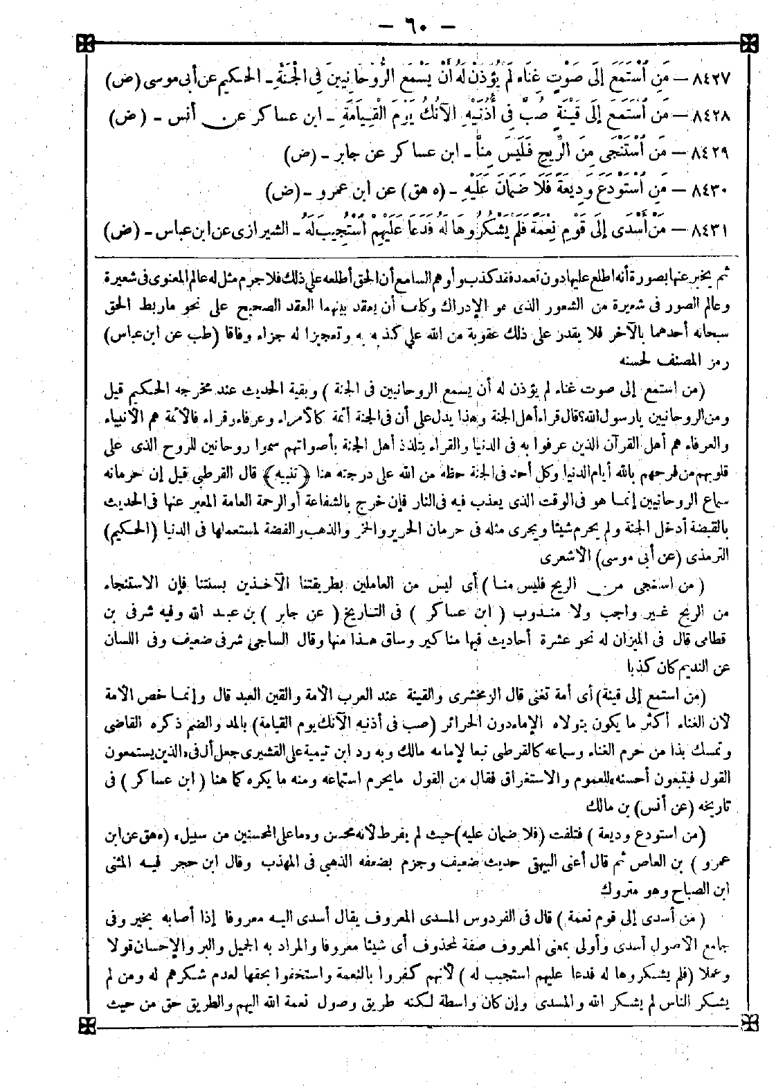 8427 - (من استمع إلى صوت غناء لم يؤذن له أن يسمع الروحانيين في الجنة) وبقية الحديث عند مخرجه الحكيم قيل: ومن الروحانيين يا رسول الله؟ قال: قراء أهل الجنة وهذا يدل على أن في الجنة أئمة كالأمراء وعرفاء وقراء فالأئمة هم الأنبياء والعرفاء هم أهل القرآن الذين عرفوا به في الدنيا والقراء يتلذذ أهل الجنة بأصواتهم سموا روحانيين للروح الذي على قلوبهم من فرحهم بالله أيام الدنيا وكل أحد في الجنة حظه من الله على درجته هنا