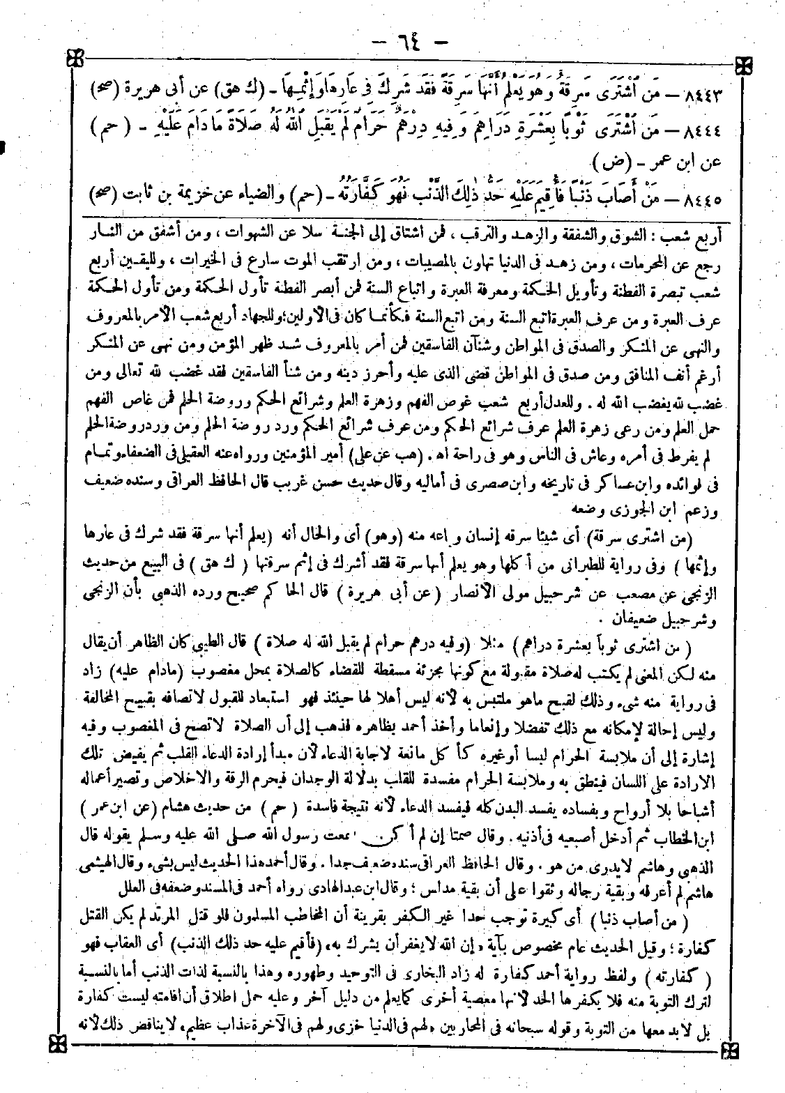 8443 - (من اشترى سرقة) أي شيئا سرقه إنسان وباعه منه (وهو) أي والحال أنه (يعلم أنها سرقة فقد شرك في عارها وإثمها) وفي رواية للطبراني من أكلها وهو يعلم أنها سرقة فقد أشرك في إثم سرقتها