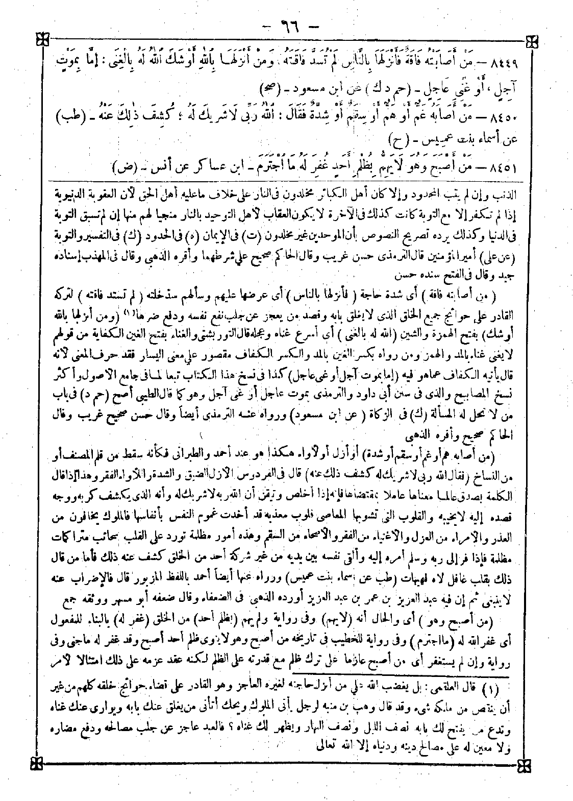 8449 - (من أصابته فاقة) أي شدة حاجة (فأنزلها بالناس) أي عرضها عليهم وسألهم سد خلته (لم تسد فاقته) لتركه القادر على حوائج جميع الخلق الذي لا يغلق بابه وقصد من يعجز عن جلب نفع نفسه ودفع ضرها (1) (ومن أنزلها بالله أوشك) بفتح الهمزة والشين (الله له بالغنى) أي أسرع غناه وعجله قال التوربشتي: والغناء بفتح الغين الكفاية من قولهم لا يغني غناء بالمد والهمزة ومن رواه بكسر الغين بالمد والكسر الكفاف مقصور على معنى اليسار فقد حرف المعنى لأنه قال يأتيه الكفاف عما هو فيه (إما بموت آجل أو غنى عاجل) كذا في نسخ هذا الكتاب تبعا لما في جامع الأصول وأكثر نسخ المصابيح والذي في سنن أبي داود والترمذي بموت عاجل أو غنى آجل وهو كما قال الطيبي أصح