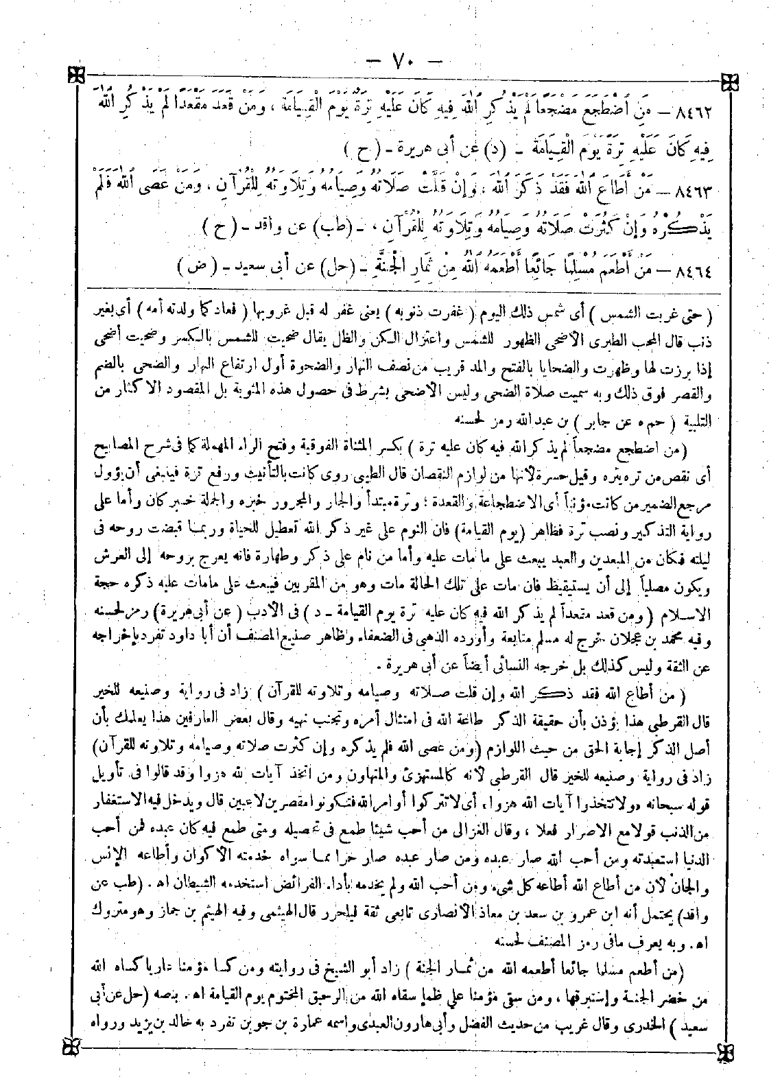 8462 - (من اضطجع مضجعا لم يذكر الله عليه كان عليه ترة) بكسر المثناة الفوقية وفتح الراء المهملة كما في شرح المصابيح أي نقص من تره يتره وقيل حسرة لأنها من لوازم النقصان قال الطيبي: روي كانت بالتأنيث ورفع ترة فينبغي أن يؤول مرجع الضمير من كانت مؤنثا أي الاضطجاعة والقعدة وترة مبتدأ والجار والمجرور خبره والجملة خبر كان وأما على رواية التذكير ونصب ترة فظاهر (يوم القيامة) فإن النوم على غير ذكر الله تعطيل للحياة وربما قبضت روحه في ليلته فكان من المبعدين والعبد يبعث على ما مات عليه وأما من نام على ذكر وطهارة فإنه يعرج بروحه إلى العرش ويكون مصليا إلى أن يستيقيظ فإن مات على تلك الحالة مات وهو من المقربين فيبعث على ما مات ذكره حجة الإسلام (ومن قعد مقعدا لم يذكر الله فيه كان عليه ترة يوم القيامة)