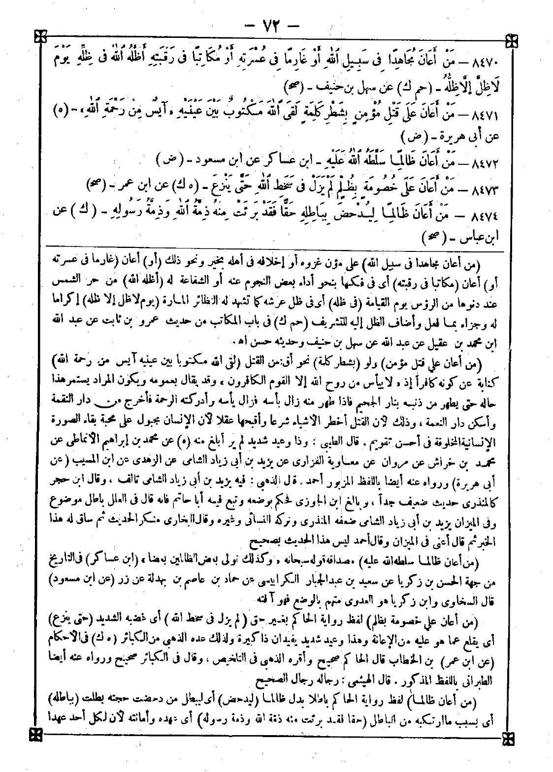 8471 - (من أعان على قتل مؤمن) ولو (بشطر كلمة) نحو أق: من القتل (لقي الله مكتوبا بين عينيه آيس من رحمة الله) كناية عن كونه كافرا إذ {لا ييأس من روح الله إلا القوم الكافرون} وقد يقال بعمومه ويكون المراد يستمر هذا حاله حتى يطهر من ذنبه بنار الجحيم فإذا طهر منه زال بأسه فزال يأسه وأدركته الرحمة فأخرج من دار النقمة وأسكن دار النعمة وذلك لأن القتل أخطر الأشياء شرعا وأقبحها عقلا لأن الإنسان مجبول على محبة بقاء الصورة الإنسانية المخلوقة في أحسن تقويم. قال الطيبي: وذا وعيد شديد لم ير أبلغ منه