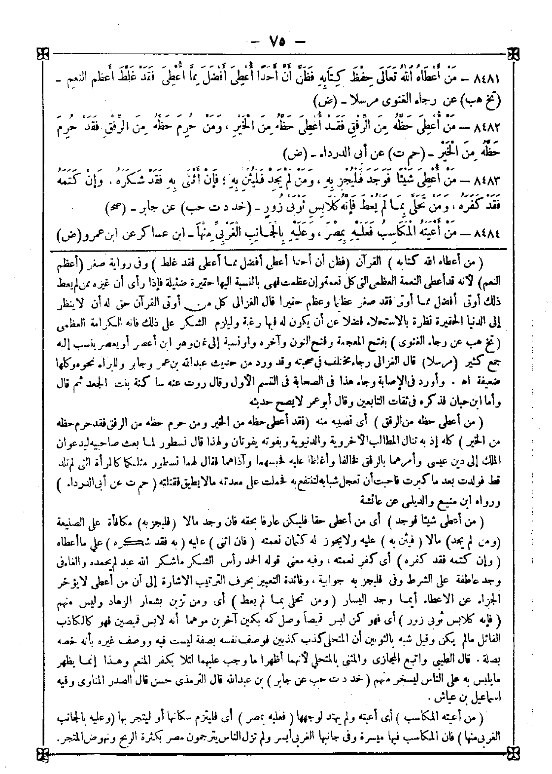 8483 - (من أعطي شيئا فوجد) أي من أعطي حقا فليكن عارفا بحقه فإن وجد مالا (فليجز به) مكافأة على الصنيعة (ومن لم يجد) مالا (فليثن به) عليه ولا يجوز له كتمان نعمته (فإن أثنى) عليه (به فقد شكره) على ما أعطاه (وإن كتمه فقد كفره) أي كفر نعمته وفيه معنى قوله الحمد رأس الشكر ما شكر الله عبد لم يحمده والفاء في وجد عاطفة على الشرط وفي فليجر به جوابية وفائدة التعبير بحرف الترتيب الإشارة إلى أن من أعطي لا يؤخر الجزاء عن الإعطاء أيما وجد اليسار (ومن تحلى بما لم يعط) أي ومن تزين بشعار الزهاد وليس منهم (فإنه كلابس ثوبي زور) أي فهو كمن لبيس قميصا وصل كمه بكمين آخرين موهما أنه لابس قميصين فهو كالكاذب القائل ما لم يكن وقيل شبه بالثوبين أن المتحلي كذب كذبين فوصف نفسه بصفة ليست فيه ووصف غيره بأنه خصه بصلة. قال الطيبي: واتبع المجازي والمثنى بالمتحلي لأنهما أظهرا ما وجب عليهما لئلا يكفر المنعم وهذا إنما يظهر ما يلبس به على الناس ليسخر منهم