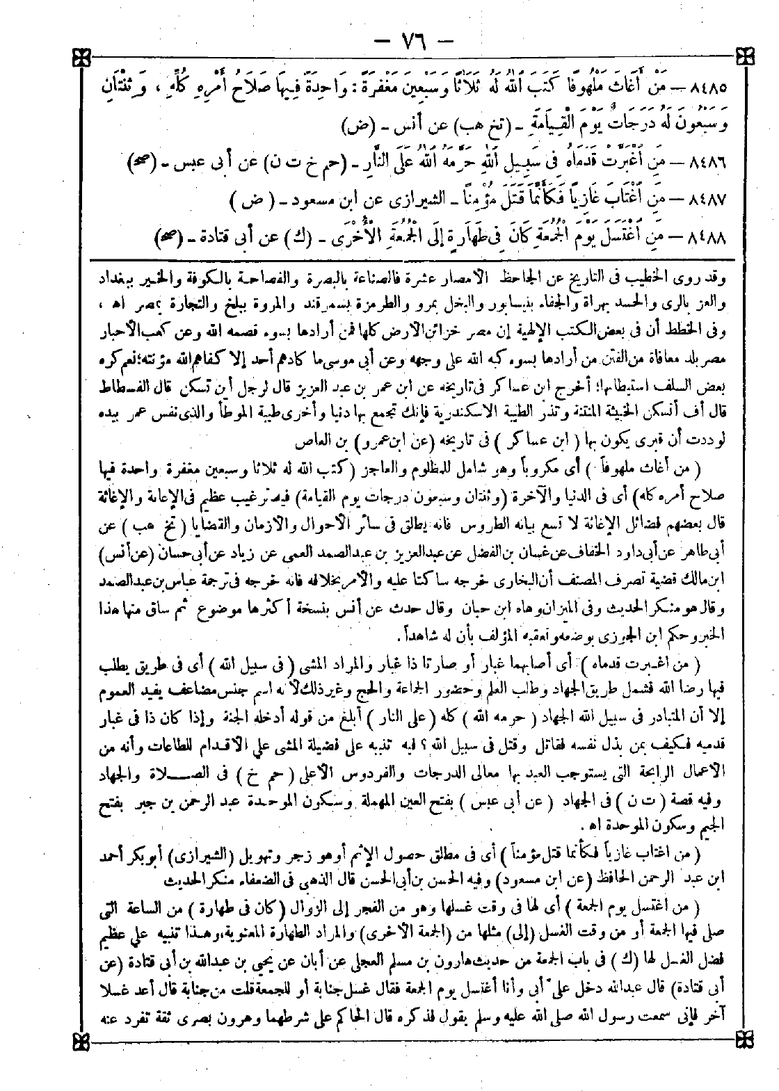 8488 - (من اغتسل يوم الجمعة) أي لها في وقت غسلها وهو من الفجر إلى الزوال (كان في طهارة) من الساعة التي صلى فيها الجمعة أو من وقت الغسل (إلى) مثلها من (الجمعة الأخرى) والمراد الطهارة المعنوية وهذا تنبيه على عظيم فضل الغسل لها