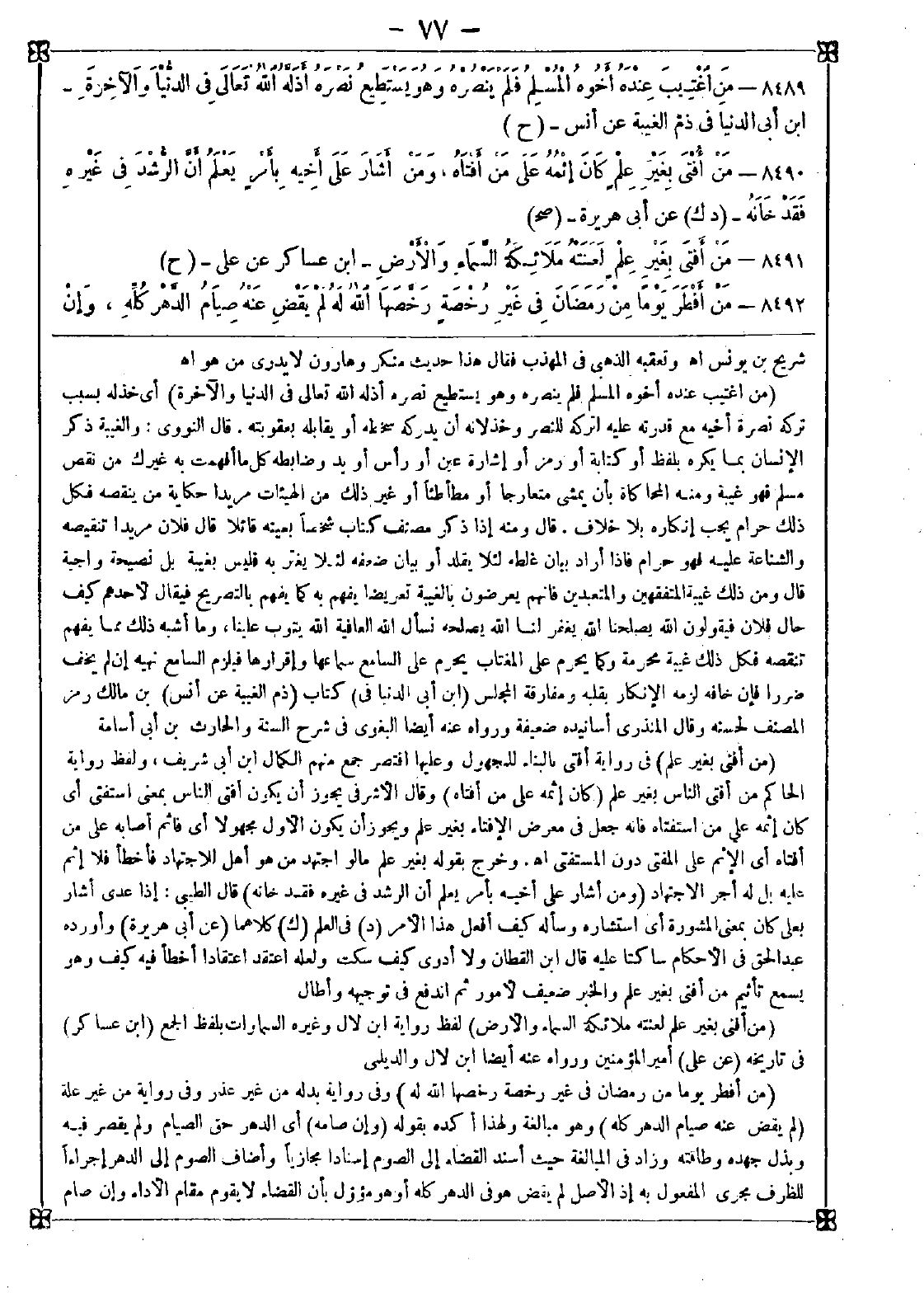 8490 - (من أفتى بغير علم) في رواية أفتى بالبناء للمجهول وعليها اقتصر جمع منهم الكمال ابن أبي شريف ولفظ رواية الحاكم من أفتى الناس بغير علم (كان إثمه على من أفتاه) وقال الأشرفي: يجوز أن يكون أفتى الناس بمعنى استفتى أي كان إثمه على من استفتاه فإنه جعل في معرض الإفتاء بغير علم ويجوز أن يكون الأول مجهولا أي فإثم أصابه على من أفتاه أي الإثم على المفتي دون المستفتى اه. وخرج بقوله بغير علم ما لو اجتهد من هو أهل للاجتهاد فأخطأ فلا إثم عليه بل له أجر الاجتهاد (ومن أشار على أخيه بأمر يعلم أن الرشد في غيره فقد خانه) قال الطيبي: إذا عدى أشار بعلى كان بمعنى المشورة أي استشاره وسأله كيف أفعل هذا الأمر