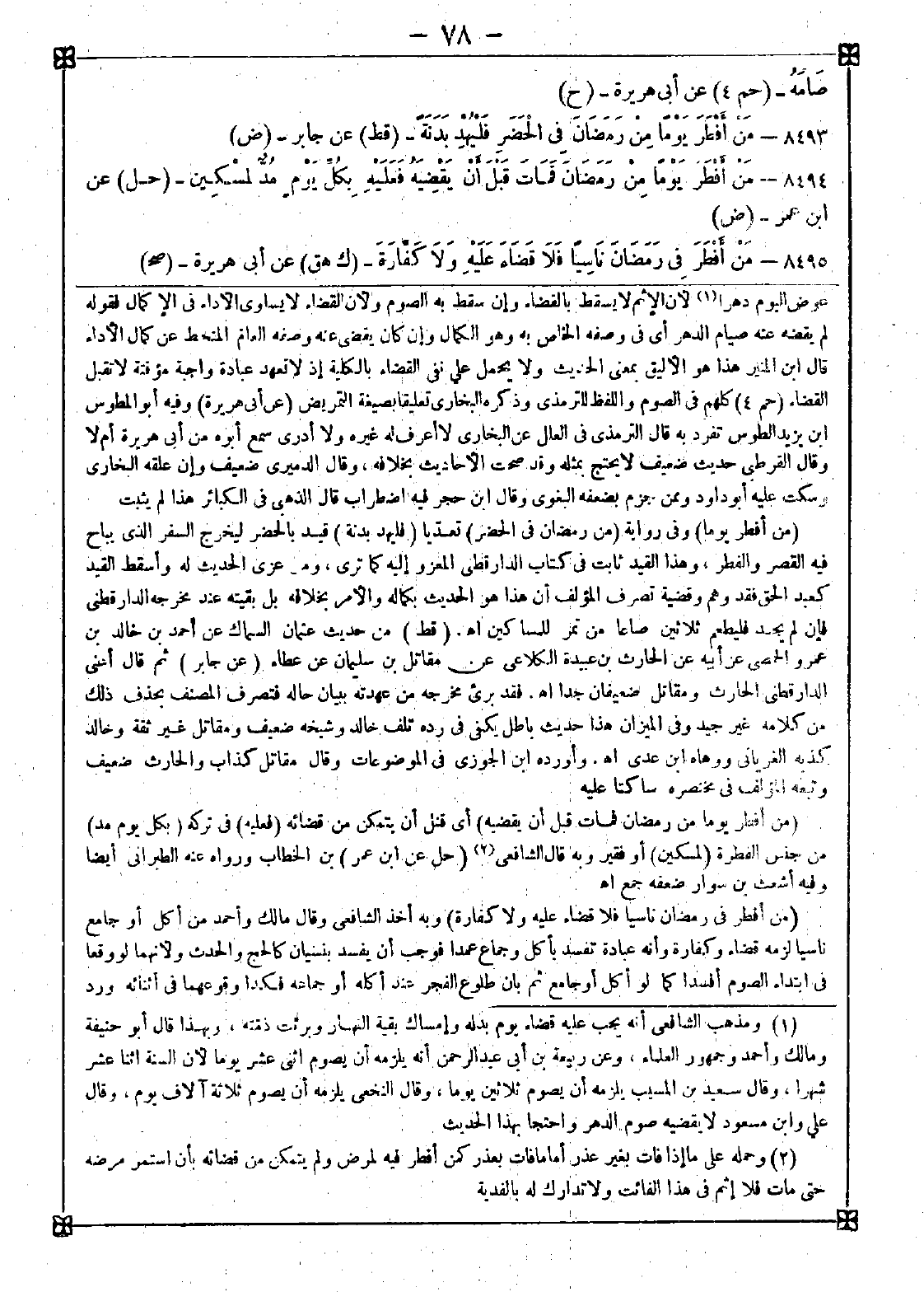 8493 - (من أفطر يوما) وفي رواية (من رمضان في الحضر) تعديا (فليهد بدنة) قيد بالحضر ليخرج السفر الذي يباح فيه القصر والفطر وهذا القيد ثابت في كتاب الدارقطني المعزو إليه كما ترى ومن عزى الحديث له وأسقط القيد كعبد الحق فقد وهم وقضية تصرف المؤلف أن هذا هو الحديث بكماله والأمر بخلافه بل بقيته عند مخرجه الدارقطني فإن لم يجد فليطعم ثلاثين صاعا من تمر للمساكين اه
