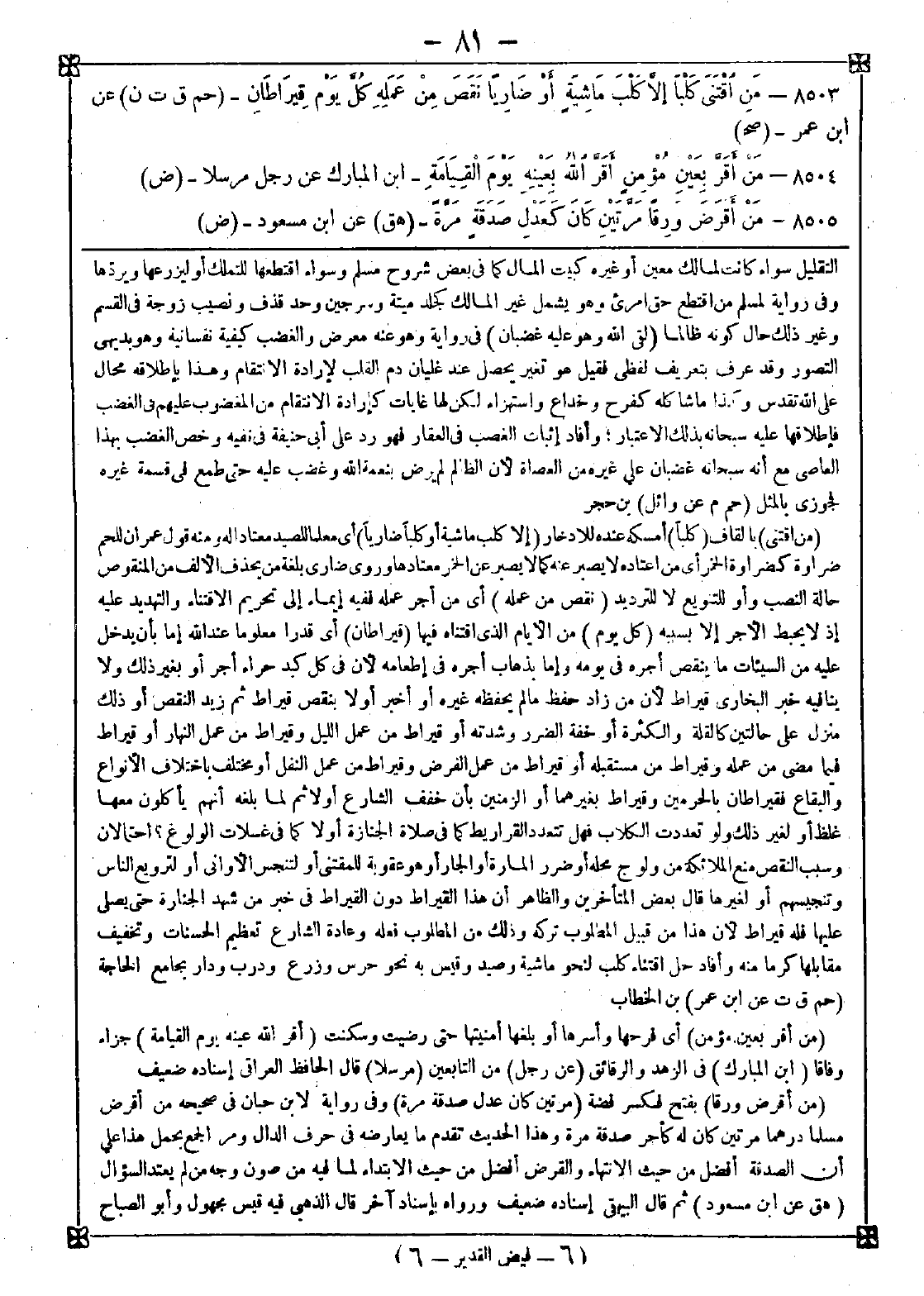 8503 - (من اقتنى) بالقاف (كلبا) أمسكه عنده للادخار (إلا كلب ماشية أو كلبا ضاريا) أي معلما للصيد معتاد له ومنه قول عمران لللحم ضراوة كضراوة الخمر أي من اعتاده لا يصبر عنه كما لا يصبر عن الخمر معتادها وروي ضاري بلغة من يحذف الألف من المنقوص حالة النصب وأو للتنويع لا للترديد (نقص من عمله) اي من أجر عمله ففيه إيماء إلى تحريم الإقتناء والتهديد عليه إذ لا يحبط الأجر إلا بسببه (كل يوم) من الأيام الذي اقتناه فيها (قيراطان) أي قدرا معلوما عند الله إما بأن يدخل عليه من السيئات ما ينقص أجره في يومه وإما بذهاب أجره في إطعامه لأن في كل كبد حراء أجر أو بغير ذلك ولا ينافيه خبر البخاري قيراط لأن من زاد حفظ ما لم يحفظه غيره أو أخبر أولا بنقص قيراط ثم زيد النقص أو ذلك منزل على حالتين كالقلة والكثرة أو خفة الضرر وشدته أو قيراط من عمل الليل وقيراط من عمل النهار أو قيراط فيما مضى من عمله وقيراط من مستقبله أو قيراط من عمل الفرض وقيراط من عمل النفل أو مختلف باختلاف الأنواع والبقاع فقيراطان بالحرمين وقيراط بغيرهما أو الزمنين بأن خفف الشارع أولا ثم لما بلغه أنهم يأكلون معها غلظ أو لغير ذلك ولو تعددت الكلاب فهل تتعدد القراريط كما في صلاة الجنازة أولا كما في غسلات الولوغ؟ احتمالان وسبب النقص منع الملائكة من ولوج محله أو ضرر المارة أو الجار أو هو عقوبة للمقتني أو لتنجس الأواني أو لترويع الناس وتنجيسهم أو لغيرها قال بعض المتأخرين: والظاهر أن هذا القيراط دون القيراط في خبر من شهد الجنازة حتى يصلى عليها فله قيراط لأن هذا من قبيل المطلوب تركه وذلك من المطلوب فعله وعادة الشارع تعظيم الحسنات وتخفيف مقابلها كرما منه وأفاد حل اقتناء كلب لنحو ماشية وصيد وقيس به نحو حرس وزرع ودرب ودار بجامع الحاجة