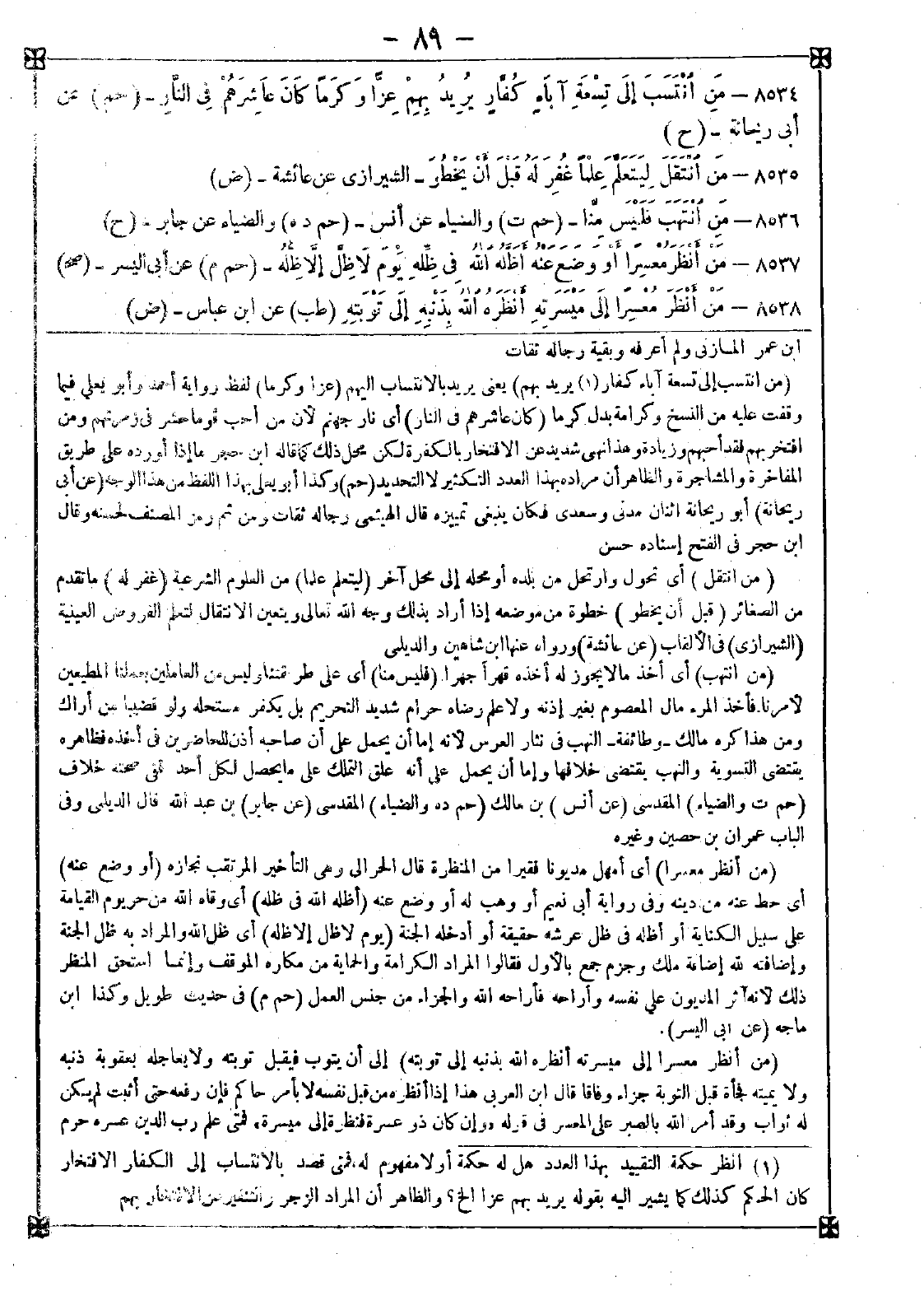 8534 - (من انتسب إلى تسعة آباء كفار (1) يريد بهم) يعني يريد بالانتساب إليهم (عزا وكرما) لفظ رواية أحمد وأبو يعلى فيما وقفت عليه من النسخ وكرامة بدل كرما (كان عاشرهم في النار) أي نار جهنم لأن من أحب قوما حشر في زمرتهم ومن افتخر بهم فقد أحبهم وزيادة وهذا نهي شديد عن الافتخار بالكفرة لكن محل ذلك كما قاله ابن حجر ما إذا أورده على طريق المفاخرة والمشاجرة والظاهر أن مراده بهذا العدد التكثير لا التحديد