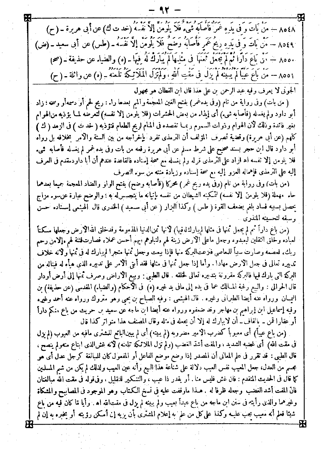 8550 - (من باع دارا ثم لم يجعل ثمنها في مثلها لم يبارك له فيها) لأنها ثمن الدنيا المذمومة وقد خلق الله الأرض وجعلها مسكنا لعباده وخلق الثقلين ليعبدوه وجعل ما على الأرض زينة لهم {لنبلوهم أيهم أحسن عملا} فصارت فتنة لهم {إلا من رحم ربك} فعصمه وصارت سببا للمعاصي فنزعت البركة منها فإذا بيعت وجعل ثمنها متجرا لم يبارك له في ثمنها ولأنه خلاف تدبيره تعالى في جعل الأرض مهادا. وأما إذا جعل ثمنها في مثلها فقد أبقى الأمر على تدبيره الذي هيأه له فيناله من البركة التي بارك فيها فالبركة مقرونة بتدبيره تعالى لخلقه. قال الطيبي: وبيع الأراضي وصرف ثمنها إلى أرض أو دار قال الحرالي: والبيع رغبة المالك عما في يده إلى ما في يد غيره