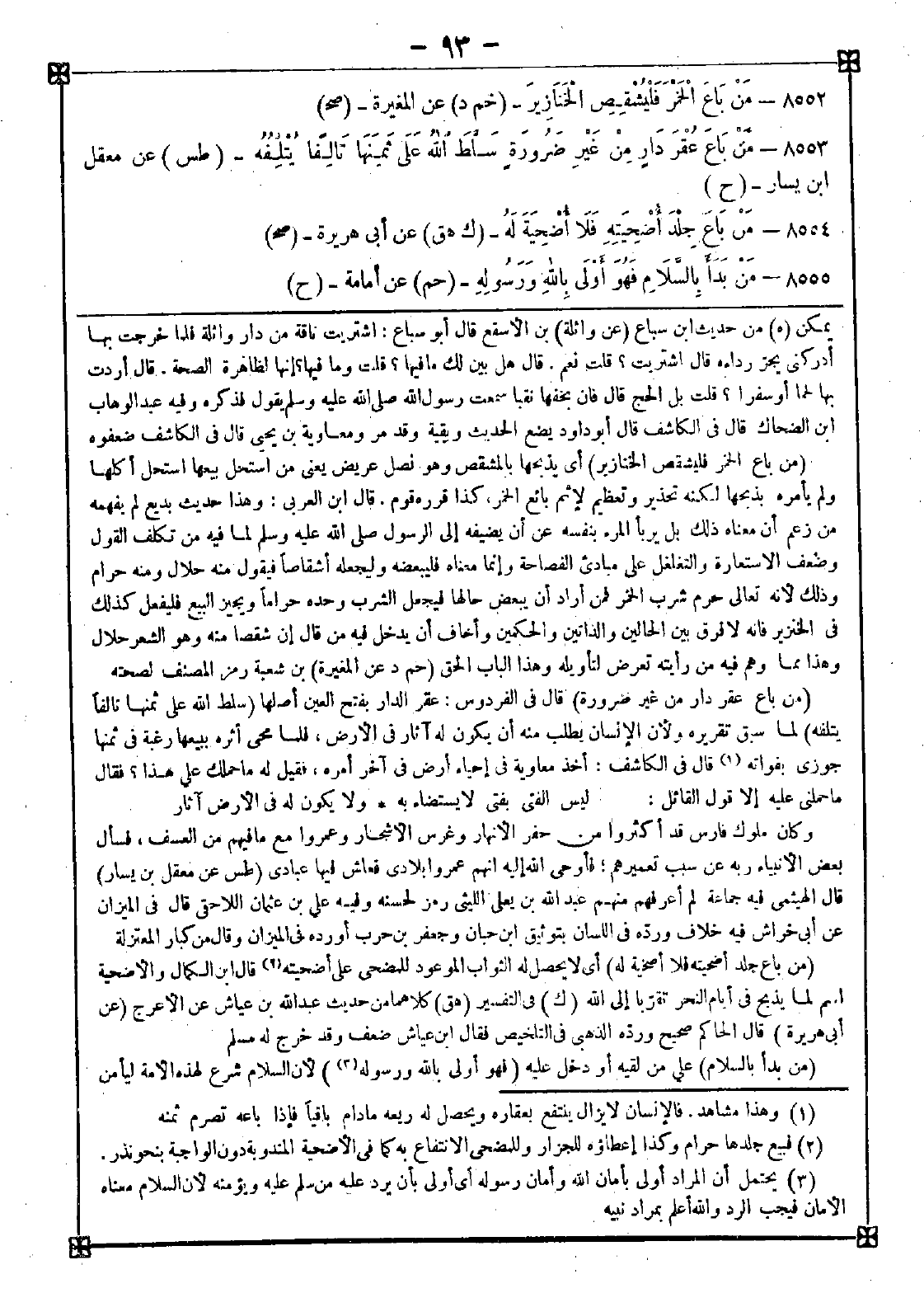 8552 - (من باع الخمر فليشقص الخنازير) أي يذبحها بالمشقص وهو نصل عريض يعني من استحل بيعها استحل أكلها ولم يأمره بذبحها لكنه تحذير وتعظيم لإثم بائع الخمر كذا قرره قوم. قال ابن العربي: وهذا حديث بديع لم يفهمه من زعم أن معناه ذلك بل يربأ المرء بنفسه عن أن يضيفه إلى الرسول صلى الله عليه وسلم لما فيه من تكلف القول وضعف الاستعارة والتغلغل على مبادىء الفصاحة وإنما معناه فليبعضه وليجعله أشقاصا فيقول منه حلال ومنه حرام وذلك لأنه تعالى حرم شرب الخمر فمن أراد أن يبعض حالها فيجعل الشرب وحده حراما ويجيز البيع فليفعل كذلك في الخنزير فإنه لا فرق بين الحالين والذاتين والحكمين وأخاف أن يدخل فيه من قال: إن شقصا منه وهو الشعر حلال وهذا مما وهم فيه من رأيته تعرض لتأويله وهذا الباب الحق