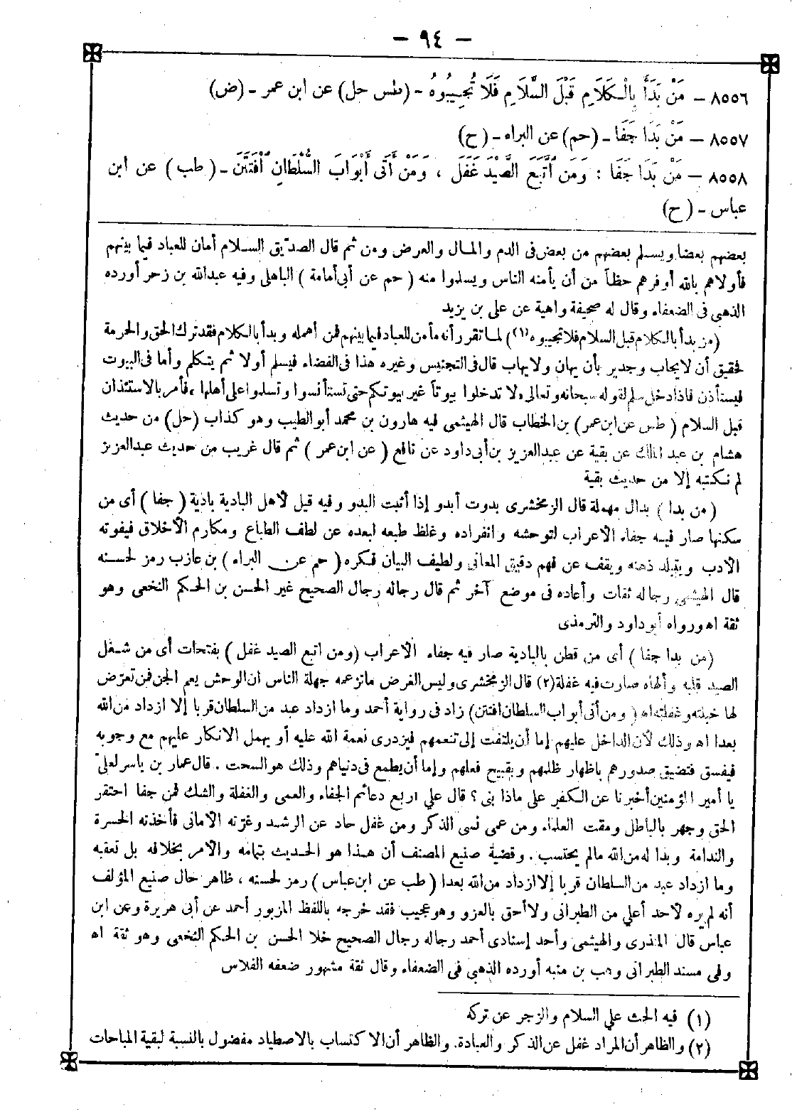8558 - (من بدا جفا) أي من قطن بالبادية صار فيه جفاء الأعراب (ومن اتبع الصيد غفل) بفتحات أي من شغل الصيد قلبه وألهاه صارت فيه غفلة (1) قال الزمخشري: وليس الغرض ما تزعمه جهلة الناس أن الوحش يعم الجن فمن تعرض لها خلبلته وغفلته اه (ومن أتى أبواب السلطان افتتن) زاد في رواية أحمد وما ازداد عبد من السلطان قربا إلا ازداد من الله بعدا اه. وذلك لأن الداخل عليهم إما أن يلتفت إلى تنعمهم فيزدري نعمة الله عليه أو يهمل الإنكار عليهم مع وجوبه فيفسق فتضيق صدورهم بإظهار ظلهم وبقبيح فعلهم وإما أن يطمع في دنياهم وذلك هو السحت. قال عمار بن ياسر لعلي: يا أمير المؤمنين أخبرنا عن الكفر على ماذا بني؟ قال علي: أربع دعائم الجفاء والعمى والغفلة والشك فمن جفا احتقر الحق وجهر بالباطل ومقت العلماء ومن عمي نسي الذكر ومن غفل حاد عن الرشد وغرته الأماني فأخذته الحسرة والندامة وبدا له من الله ما لم يحتسب. وقضية صنيع المصنف أن هذا هو الحديث بتمامه والأمر بخلافه بل تعقبه وما ازداد عبد من السلطان قربا إلا ازداد من الله بعدا