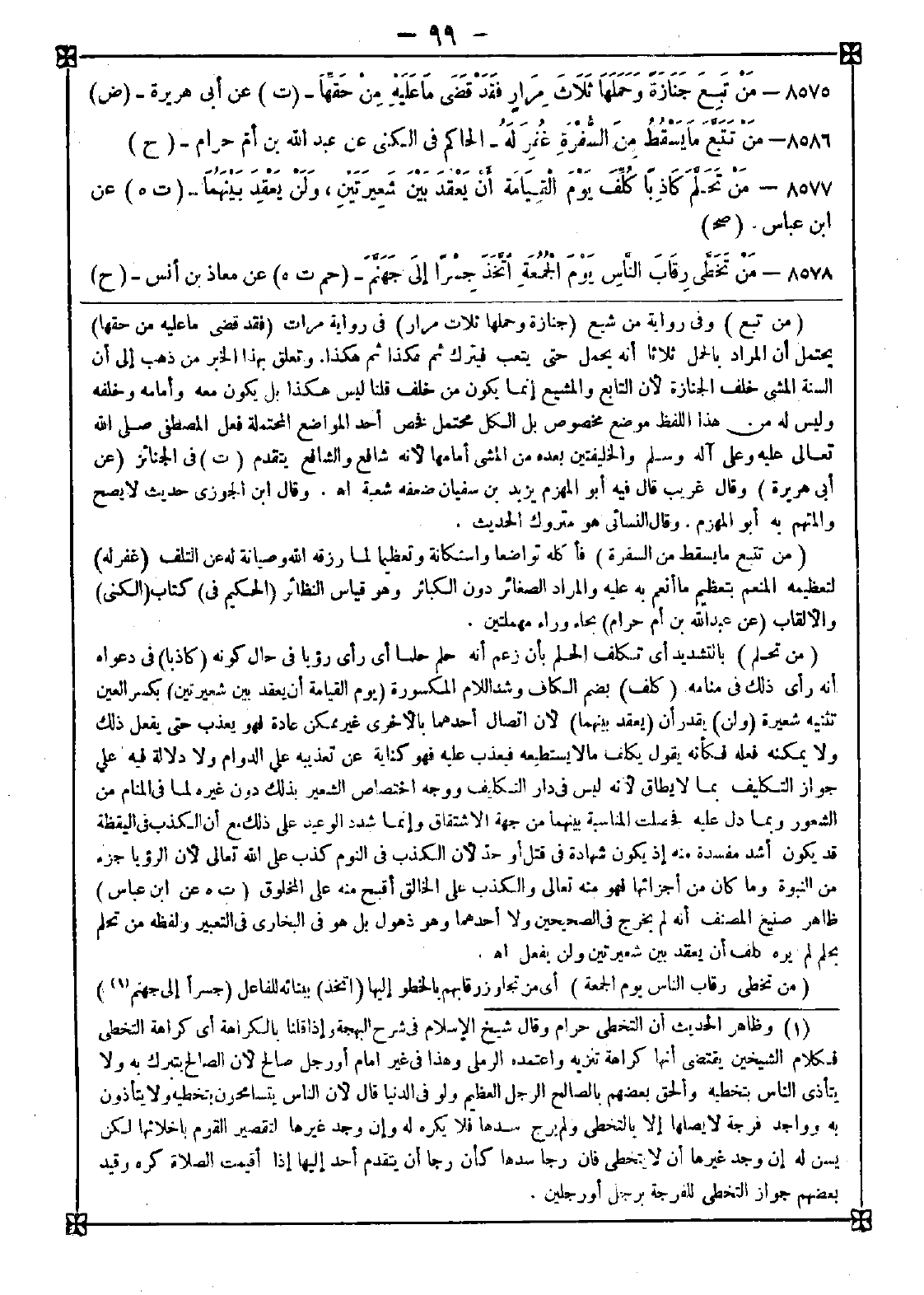 8578 - (من تخطى رقاب الناس يوم الجمعة) أي من تجاوز رقابهم بالخطو إليها (اتخذ) ببنائه للفاعل (جسرا إلى جهنم (1)) -[100]- أي اتخذ لنفسه جسرا يمر عليه إلى جهنم بسبب ذلك أو للمفعول أي يجعل جسرا يمر عليه من يساق لجهنم جزاء لكل بمثل عمله وضعفه التوربشتي قال الزين العراقي: والمشهور في رواية هذا الحديث اتخذ ببنائه للمفعول بضم التاء وكسر الخاء بمعنى أنه يجعل جسرا على طريق جهنم ليوطأ ويتخطى كما يتخطى رقاب الناس قال: ويجوز بناءه للفاعل والأول أظهر وأوفق للرواية وقد ذكره الديلمي بلفظ من تخطى رقبة أخيه المسلم جعله الله يوم القيامة جسرا ممتدا إلى جهنم اه. والتخطي حرام في بعض صوره ومكروه في بعضها ومحل التفصيل كتب الفروع