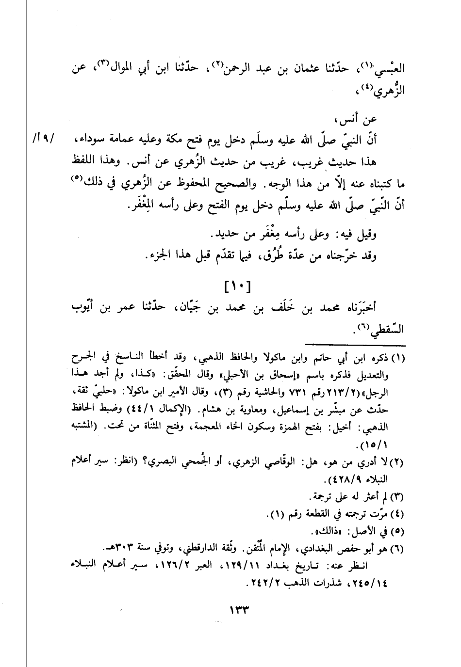 10 - أَخْبَرَنَاهُ مُحَمَّدُ بْنُ خَلَفِ بْنِ مُحَمَّدِ بْنِ جيَّانَ، حَدَّثَنَا عُمَرُ بْنُ أَيُّوبَ السَّقَطِيُّ، -[134]- وَأَخْبَرَنَاهُ مُوسَى بْنُ عِيسَى بْنِ عَبْدِ اللَّهِ، حَدَّثَنَا عَبْدُ اللَّهِ بْنُ سُلَيْمَانَ، قَالَا: حَدَّثَنَا مُحَمَّدُ بْنُ سُلَيْمَانَ لُوَيْنٌ، حَدَّثَنَا مَالِكُ بْنُ أَنَسٍ، عَنِ الزُّهْرِيِّ، وَقَالَ ابْنُ جيَّانَ: عَنِ ابْنِ شِهَابٍ، عَنْ أَنَسِ بْنِ مَالِكٍ، قَالَ: دَخَلَ رَسُولُ اللَّهِ صَلَّى اللَّهُ عَلَيْهِ وَسَلَّمَ يَوْمَ الْفَتْحِ §وَعَلَى رَأْسِهِ مِغْفَرٌ، فَقِيلَ: هَذَا ابْنُ خَطَلٍ مُتَعَلِّقٌ بِأَسْتَارِ الْكَعْبَةِ، فَقَالَ: «اقْتُلُوهُ» . -[135]- وَهَذَا لَفْظُ مُوسَى، وَقَالَ ابْنُ جيَّانَ: إِنَّ النَّبِيَّ صَلَّى اللَّهُ عَلَيْهِ وَسَلَّمَ دَخَلَ مَكَّةَ وَعَلَى رَأْسِهِ مِغْفَرٌ، فَقِيلَ لَهُ: هَذَا ابْنُ خَطَلٍ مُتَعَلِّقٌ بِالْأَسْتَارِ، فَقَالَ: «اقْتُلُوهُ»