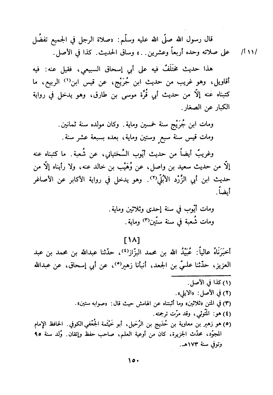18 - أَخْبَرَنَاهُ عَالِيًا عُبَيْدُ اللَّهِ بْنُ مُحَمَّدٍ الْبَزَّازُ، حَدَّثَنَا عَبْدُ اللَّهِ بْنُ مُحَمَّدِ بْنِ عَبْدِ الْعَزِيزِ، حَدَّثَنَا عَلِيُّ بْنُ الْجَعْدِ، أَنْبَأَنَا زُهَيْرٌ، عَنْ أَبِي إِسْحَاقَ، عَنْ عَبْدِ اللَّهِ -[151]- بْنِ أَبِي بَصِيرٍ، عَنْ أَبِيهِ، قَالَ: قَدِمْتُ الْمَدِينَةَ، فَلَقِيتُ أُبَيَّ بْنَ كَعْبٍ، فَقُلْتُ: يَا أَبَا الْمُنْذِرِ حَدِّثْنِي بِأَعْجَبِ حَدِيثٍ سَمِعْتَهُ مِنْ رَسُولِ اللَّهِ صَلَّى اللَّهُ عَلَيْهِ وَسَلَّمَ، فَقَالَ: صَلَّى بِنَا، أَوْ صَلَّى لَنَا رَسُولُ اللَّهِ صَلَّى اللَّهُ عَلَيْهِ وَسَلَّمَ صَلَاةَ الْغَدَاةِ، ثُمَّ قَالَ: «أَشَاهِدٌ فُلَانٌ؟» قُلْنَا: نَعَمْ، وَلَمْ يَشْهَدِ الصَّلَاةَ، قَالَ: «إِنَّ §أَثْقَلَ الصَّلَوَاتِ عَلَى الْمُنَافِقِينَ صَلَاةُ الْعِشَاءِ وَصَلَاةُ الْفَجْرِ، وَلَوْ يَعْلَمُونَ مَا فِيهِمَا لَأَتَوْهُمَا وَلَوْ حَبْوًا، وَإِنَّ الصَّفَّ الْأَوَّلَ عَلَيَّ مِثْلُ صَفِّ الْمَلَائِكَةِ، وَلَوْ تَعْلَمُونَ فَضِيلَتَهُ لَابْتَدَرْتُمُوهُ، وَإِنَّ صَلَاتَكَ مَعَ رَجُلٍ أَزْكَى مِنْ صَلَاتِكَ وَحْدَكَ، وَإِنَّ صَلَاتَكَ مَعَ رَجُلَيْنِ أَزْكَى مِنْ صَلَاتِكِ مَعَ رَجُلٍ، وَمَا أَكْثَرْتَ أَحَبُّ إِلَى اللَّهِ عَزَّ وَجَلَّ»