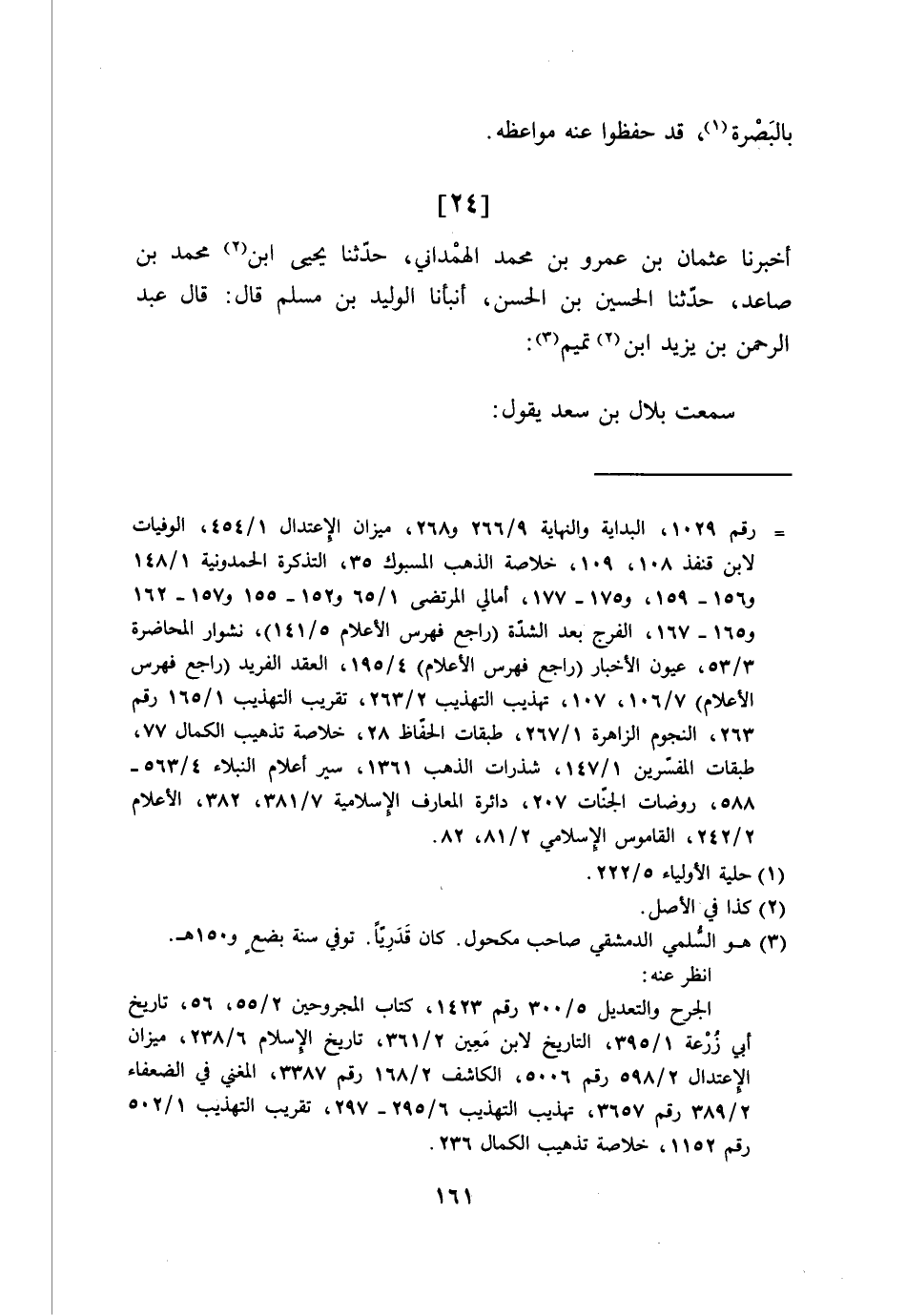 24 - أَخْبَرَنَا عُثْمَانُ بْنُ عَمْرِو بْنِ مُحَمَّدٍ الْهَمْدَانِيُّ، حَدَّثَنَا يَحْيَى بْنُ مُحَمَّدِ بْنِ صَاعِدٍ، حَدَّثَنَا الْحُسَيْنُ بْنُ الْحَسَنِ، أَنْبَأَنَا الْوَلِيدُ بْنُ مُسْلِمٍ، قَالَ: قَالَ عَبْدُ الرَّحْمَنِ بْنُ يَزِيدَ بْنُ تَمِيمٍ: سَمِعْتُ بِلَالَ بْنَ سَعْدٍ يَقُولُ: -[162]- «يَا أَهْلَ الْخُلُودِ، يَا أَهْلَ الْبَقَاءِ، §إِنَّكُمْ لَمْ تُخْلَقُوا لِلْفَنَاءِ، وَإِنَّمَا تُنْقَلُونَ مِنْ دَارٍ إِلَى دَارٍ، كَمَا نُقِلْتُمْ مِنَ الْأَصْلَابِ إِلَى الْأَرْحَامِ، وَمِنَ الْأَرْحَامِ إِلَى الدُّنْيَا، وَمِنَ الدُّنْيَا إِلَى الْقُبُورِ، وَمَنَ الْقُبُورِ إِلَى الْمَوْقِفِ، وَمَنَ الْمَوْقِفِ إِلَى الْخُلُودِ فِي الْجَنَّةِ أَوِ النَّارِ»