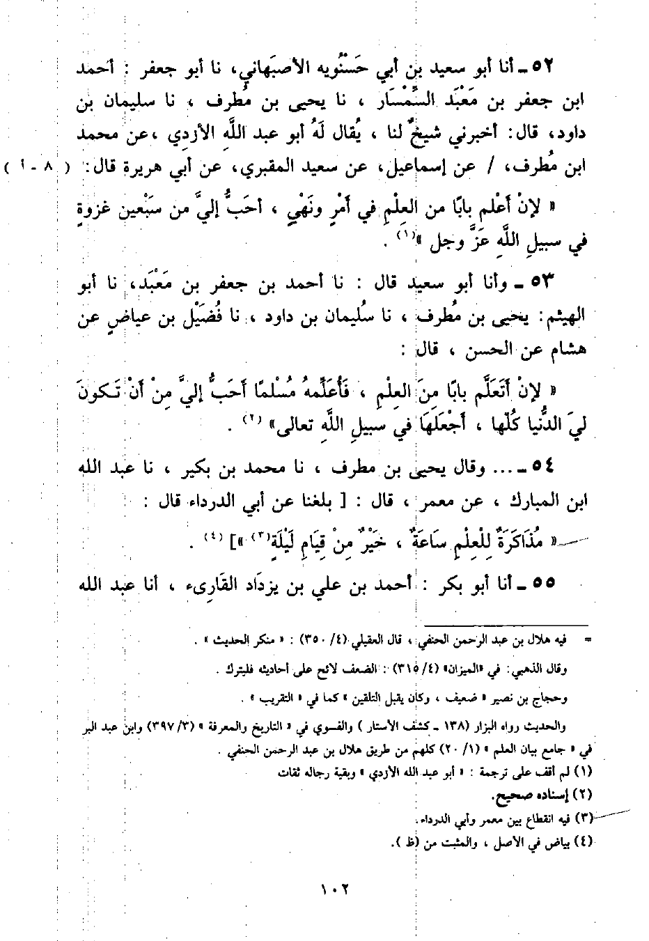 أنا أَبُو سَعِيدِ بْنُ أَبِي حَسْنُوَيْهِ الْأَصْبَهَانِيُّ , نا أَبُو جَعْفَرٍ أَحْمَدُ بْنُ جَعْفَرِ بْنِ مَعْبَدٍ السِّمْسَارُ , نا يَحْيَى بْنُ مُطَرِّفٍ , نا سُلَيْمَانُ بْنُ دَاوُدَ , قَالَ: أَخْبَرَنِي شَيْخٌ , لَنَا , يُقَالُ لَهُ أَبُو عَبْدِ اللَّهِ الْأَزْدِيُّ , عَنْ مُحَمَّدِ بْنِ مُطَرِّفٍ , عَنْ إِسْمَاعِيلَ , عَنْ سَعِيدٍ الْمَقْبُرِيِّ , عَنْ أَبِي هُرَيْرَةَ , قَالَ: «لَأَنْ أَعْلَمَ بَابًا مِنَ الْعِلْمِ فِي أَمْرٍ وَنَهْيٍ أَحَبُّ إِلَيَّ مِنْ سَبْعِينَ غَزْوَةً فِي سَبِيلِ اللَّهِ عَزَّ وَجَلَّ»