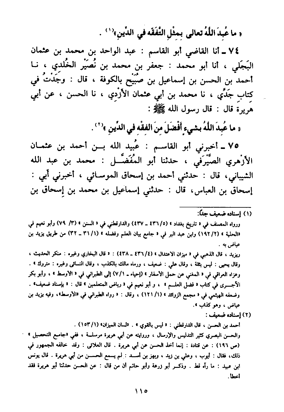 أنا الْقَاضِي أَبُو الْقَاسِمِ عَبْدُ الْوَاحِدِ بْنُ مُحَمَّدِ بْنِ عُثْمَانَ الْبَجَلِيُّ , أنا أَبُو مُحَمَّدٍ جَعْفَرُ بْنُ مُحَمَّدِ بْنِ نُصَيْرٍ الْخُلْدِيُّ , نا أَحْمَدُ بْنُ الْحَسَنِ بْنِ إِسْمَاعِيلَ بْنِ صَبِيحٍ , بِالْكُوفَةِ قَالَ: وَجَدْتُ فِي كِتَابِ جَدِّي , نا مُحَمَّدُ بْنُ أَبِي عُثْمَانَ الْأَزْدِيُّ , نا الْحَسَنُ عَنْ أَبِي هُرَيْرَةَ قَالَ: قَالَ رَسُولُ اللَّهِ صَلَّى اللهُ عَلَيْهِ وَسَلَّمَ: «مَا عُبِدَ اللَّهُ بِشَيْءٍ أَفْضَلَ مِنَ الْفِقْهِ فِي الدِّينِ»
