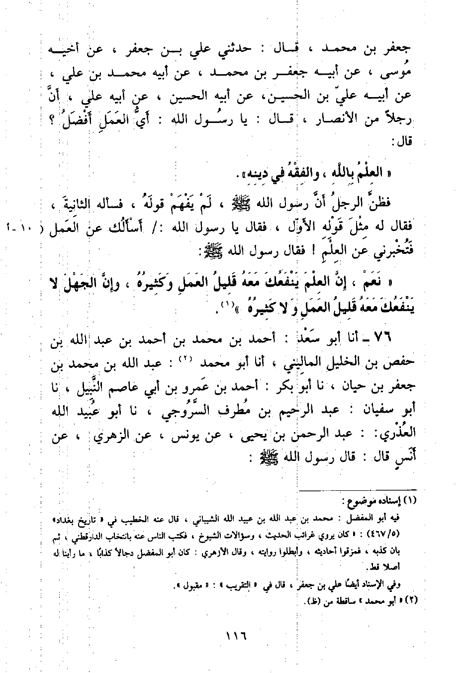 جَعْفَرِ بْنِ مُحَمَّدٍ , قَالَ: حَدَّثَنِي عَلِيُّ بْنُ جَعْفَرٍ , عَنْ أَخِيهِ مُوسَى , عَنْ أَبِيهِ جَعْفَرِ بْنِ مُحَمَّدٍ , عَنْ أَبِيهِ مُحَمَّدِ بْنِ عَلِيٍّ , عَنْ أَبِيهِ عَلِيِّ بْنِ الْحُسَيْنِ , عَنْ أَبِيهِ الْحُسَيْنِ , عَنْ أَبِيهِ عَلِيٍّ , أَنَّ رَجُلًا مِنَ الْأَنْصَارِ قَالَ: يَا رَسُولَ اللَّهِ: أَيُّ الْعَمَلِ أَفْضَلُ؟ قَالَ: «الْعِلْمُ بِاللَّهِ , وَالْفِقْهُ فِي دِينِهِ» فَظَنَّ الرَّجُلُ أَنَّ رَسُولَ اللَّهِ صَلَّى اللهُ عَلَيْهِ وَسَلَّمَ , لَمْ يَفْهَمْ قَوْلَهُ , فَسَأَلَهُ الثَّانِيَةَ , فَقَالَ لَهُ مِثْلَ قَوْلِهِ الْأَوَّلِ , فَقَالَ: يَا رَسُولَ اللَّهِ: أَسْأَلُكَ عَنِ الْعَمَلِ فَتُخْبِرُنِي عَنِ الْعِلْمِ فَقَالَ رَسُولُ اللَّهِ صَلَّى اللهُ عَلَيْهِ وَسَلَّمَ: «نَعَمْ , إِنَّ الْعِلْمَ يَنْفَعُكَ مَعَهُ قَلِيلُ الْعَمَلِ وَكَثِيرُهُ , وَإِنَّ الْجَهْلَ لَا يَنْفَعُكَ مَعَهُ قَلِيلُ الْعَمَلِ وَلَا كَثِيرُهُ»