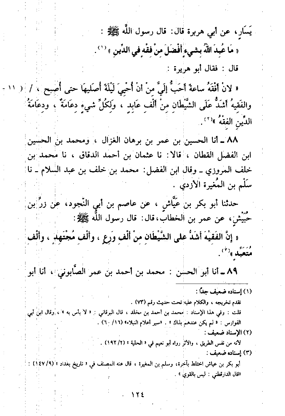 أنا الْحُسَيْنُ بْنُ عُمَرَ بْنِ بُرْهَانٍ الْغَزَّالُ , ومُحَمَّدُ بْنُ الْحُسَيْنِ بْنِ الْفَضْلِ الْقَطَّانُ , قَالَا: نا عُثْمَانُ بْنُ أَحْمَدَ الدَّقَّاقُ , نا مُحَمَّدُ بْنُ خَلَفٍ الْمَرْوَزِيُّ , - وَقَالَ ابْنُ الْفَضْلِ مُحَمَّدُ بْنُ خَلَفِ بْنِ عَبْدِ السَّلَامِ - نا سَلْمُ بْنُ الْمُغِيرَةِ الْأَزْدِيُّ , حَدَّثَنَا أَبُو بَكْرِ بْنُ عَيَّاشٍ , عَنْ عَاصِمِ بْنِ أَبِي النَّجُودِ , عَنْ زِرِّ بْنِ حُبَيْشٍ , عَنْ عُمَرَ بْنِ الْخَطَّابِ , قَالَ: قَالَ رَسُولُ اللَّهِ صَلَّى اللهُ عَلَيْهِ وَسَلَّمَ: «إِنَّ الْفَقِيهَ أَشَدُّ عَلَى الشَّيْطَانِ مِنْ أَلْفِ وَرِعٍ , وَأَلْفِ مُجْتَهِدٍ , وَأَلْفِ مُتَعَبِّدٍ»