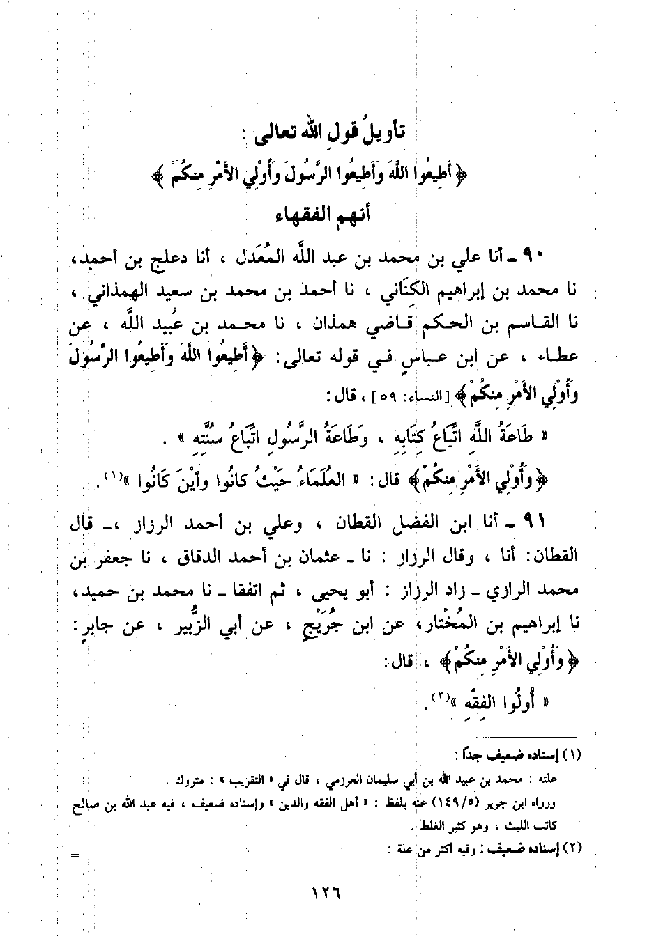 أنا عَلِيُّ بْنُ مُحَمَّدِ بْنِ عَبْدِ اللَّهِ الْمُعَدِّلُ , أنا دَعْلَجُ بْنُ أَحْمَدَ , نا مُحَمَّدُ بْنُ إِبْرَاهِيمَ الْكِنَانِيُّ , نا أَحْمَدُ بْنُ مُحَمَّدِ بْنِ سَعِيدِ الهَمَذَانِيُّ نا القَاسِمُ بْنُ الحَكَمِ قَاضِي هَمَذَانَ نا مُحَمَّدِ بْنِ عُبَيْدِ اللَّهِ , عَنْ عَطَاءٍ , عَنِ ابْنِ عَبَّاسٍ , فِي قَوْلِهِ تَعَالَى: {أَطِيعُوا اللَّهَ وَأَطِيعُوا الرَّسُولَ وَأُولِي الْأَمْرِ مِنْكُمْ} [النساء: ٥٩] قَالَ: «طَاعَةُ اللَّهِ اتِّبَاعُ كِتَابِهِ , وَطَاعَةُ الرَّسُولِ اتِّبَاعُ سُنَّتِهِ» {وَأُولِي الْأَمْرِ مِنْكُمْ} [النساء: ٥٩] قَالَ: «الْعُلَمَاءُ حَيْثُ كَانُوا وَأَيْنَ كَانُوا»