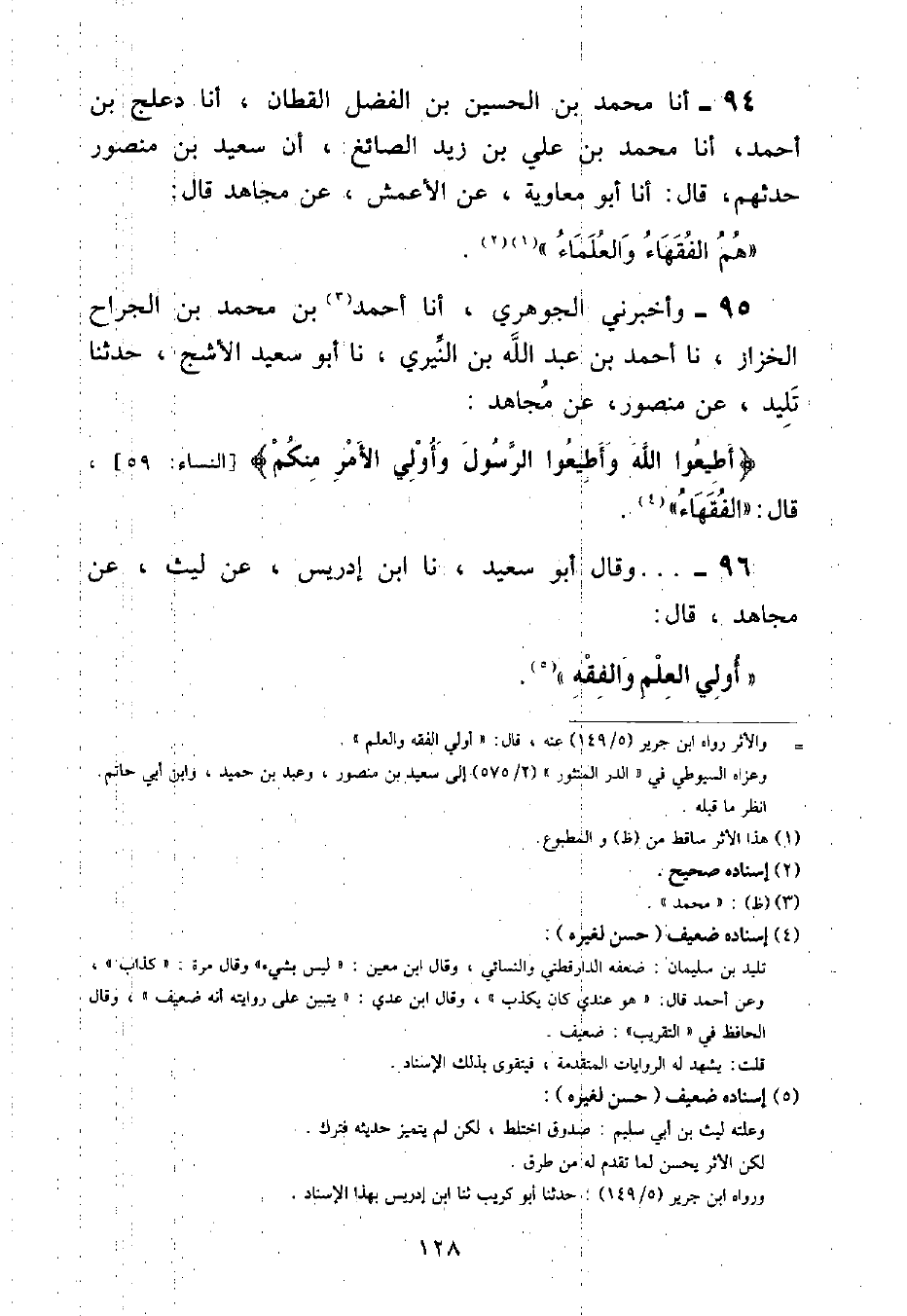 أنا مُحَمَّدُ بْنُ الْحُسَيْنِ بْنِ الْفَضْلِ الْقَطَّانُ , أنا دَعْلَجُ بْنُ أَحْمَدَ , أنا مُحَمَّدُ بْنُ عَلِيِّ بْنِ زَيْدٍ الصَّائِغُ , أَنَّ سَعِيدَ بْنَ مَنْصُورٍ , حَدَّثَهُمْ قَالَ: أنا أَبُو مُعَاوِيَةَ , عَنِ الْأَعْمَشِ , عَنْ مُجَاهِدٍ , قَالَ: «هُمُ الْفُقَهَاءُ وَالْعُلَمَاءُ»