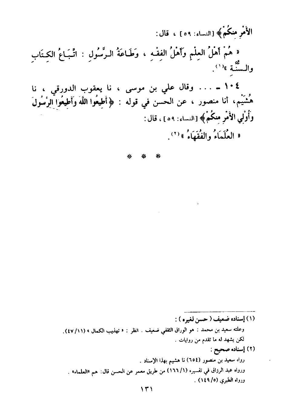وَقَالَ عَلِيُّ بْنُ مُوسَى , نا يَعْقُوبُ الدَّوْرَقِيُّ , نا هُشَيْمٌ , أنا مَنْصُورٌ , عَنِ الْحَسَنِ , فِي قَوْلِهِ: {أَطِيعُوا اللَّهَ وَأَطِيعُوا الرَّسُولَ وَأُولِي الْأَمْرِ مِنْكُمْ} [النساء: ٥٩] قَالَ: «الْعُلَمَاءُ وَالْفُقَهَاءُ»
