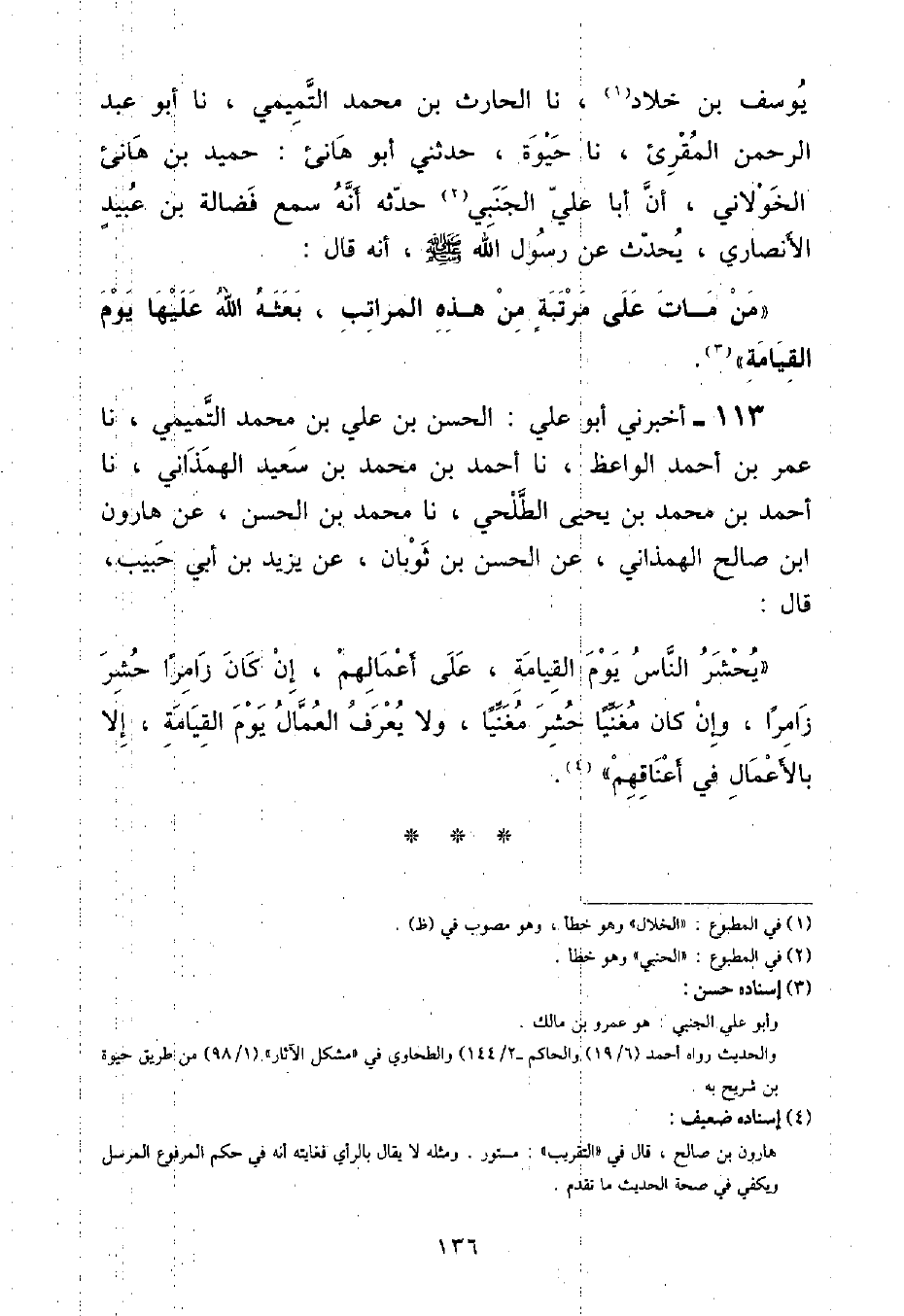 أَخْبَرَنِي أَبُو عَلِيٍّ الْحَسَنُ بْنُ عَلِيِّ بْنِ مُحَمَّدٍ التَّمِيمِيُّ , نا عُمَرُ بْنُ أَحْمَدَ الْوَاعِظُ , نا أَحْمَدُ بْنُ مُحَمَّدِ بْنِ سَعِيدٍ الْهَمَذَانِيُّ , نا أَحْمَدُ بْنُ مُحَمَّدِ بْنِ يَحْيَى الطَّلْحِيُّ , نا مُحَمَّدُ بْنُ الْحَسَنِ , عَنْ هَارُونَ بْنِ صَالِحٍ الْهَمَذَانِيِّ , عَنِ الْحَسَنِ بْنِ ثَوْبَانَ , عَنْ يَزِيدَ بْنِ أَبِي حَبِيبٍ , قَالَ: «يُحْشَرُ النَّاسُ يَوْمَ الْقِيَامَةِ عَلَى أَعْمَالِهِمْ , إِنْ كَانَ زَامِرًا حُشِرَ زَامِرًا , وَإِنْ كَانَ مُغَنِّيًا حُشِرَ مُغَنِّيًا , وَلَا يُعْرَفُ الْعُمَّالُ يَوْمَ الْقِيَامَةِ إِلَّا بِالْأَعْمَالِ فِي أَعْنَاقِهِمْ»