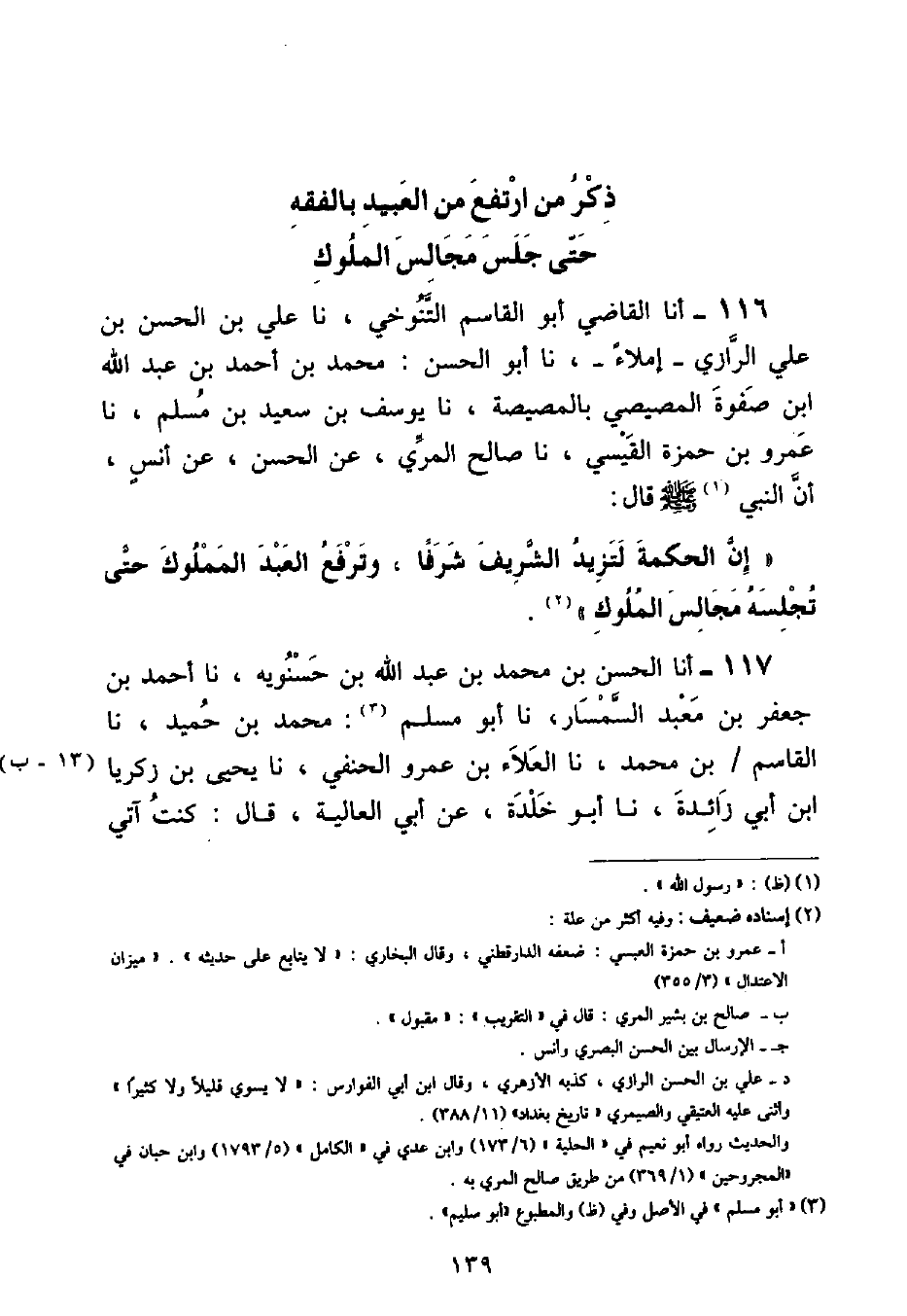 أنا الْقَاضِي أَبُو الْقَاسِمِ التَّنُوخِيُّ , نا عَلِيُّ بْنُ الْحَسَنِ بْنِ عَلِيٍّ الرَّازِيُّ , - إِمْلَاءً - , نا أَبُو الْحَسَنِ مُحَمَّدُ بْنُ أَحْمَدَ بْنِ عَبْدِ اللَّهِ بْنِ صَفْوَةَ الْمِصِّيصِيُّ بِالْمَصِّيصَةِ , نا يُوسُفُ بْنُ سَعِيدِ بْنِ مُسْلِمٍ , نا عَمْرُو بْنُ حَمْزَةَ الْقَيْسِيُّ , نا صَالِحٌ الْمُرِّيُّ , عَنِ الْحَسَنِ , عَنْ أَنَسٍ , أَنَّ النَّبِيَّ صَلَّى اللهُ عَلَيْهِ وَسَلَّمَ قَالَ: «إِنَّ الْحِكْمَةَ لَتَزِيدُ الشَّرِيفَ شَرَفًا , وَتَرْفَعُ الْعَبْدَ الْمَمْلُوكَ حَتَّى تُجْلِسَهُ مَجَالِسَ الْمُلُوكِ»