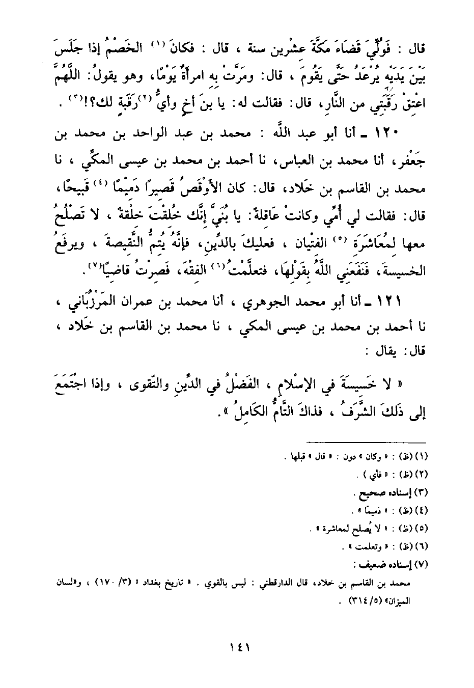 أنا أَبُو مُحَمَّدٍ الْجَوْهَرِيُّ , أنا مُحَمَّدُ بْنُ عِمْرَانَ الْمَرْزَبَانِيُّ , نا أَحْمَدُ بْنُ مُحَمَّدِ بْنِ عِيسَى الْمَكِّيُّ , نا مُحَمَّدُ بْنُ الْقَاسِمِ بْنِ خَلَّادٍ , قَالَ: يُقَالُ: «لَا خَسِيسَةَ فِي الْإِسْلَامِ , الْفَضْلُ فِي الدِّينِ وَالتَّقْوَى , وَإِذَا اجْتَمَعَ إِلَى ذَلِكَ الشَّرَفُ , فَذَاكَ التَّامُّ الْكَامِلُ»