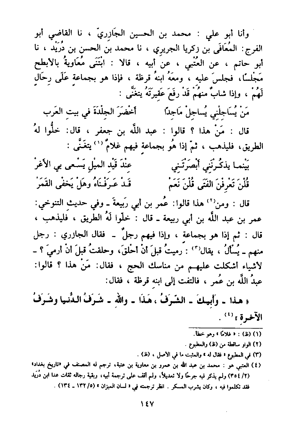 قَالَ: وَمِنْ هَذَا قَالُوا: عُمَرُ بْنُ أَبِي رَبِيعَةَ - وَفِي حَدِيثِ التَّنُوخِيِّ: عُمَرُ بْنُ عَبْدِ اللَّهِ بْنِ أَبِي رَبِيعَةَ - قَالَ: خَلُّوا لَهُ الطَّرِيقَ , فَلْيَذْهَبْ قَالَ: ثُمَّ إِذَا هُوَ بِجَمَاعَةٍ , وَإِذَا فِيهِمْ رَجُلٌ - فَقَالَ الْجَازِرِيُّ: رَجُلٌ مِنْهُمْ - يَسْأَلُ , يُقَالُ: رَمَيْتُ قَبْلَ أَنْ أَحْلِقَ , وَحَلَقْتُ قَبْلَ أَنْ أَرْمِيَ؟ - لِأَشْيَاءَ أُشْكِلَتْ عَلَيْهِمْ مِنْ مَنَاسِكِ الْحَجِّ , فَقَالَ: مِنْ هَذَا؟ قَالُوا: عَبْدُ اللَّهِ بْنُ عُمَرَ , فَالْتَفَتَ إِلَى ابْنِهِ قَرَظَةَ , فَقَالَ: «هَذَا - وَأَبِيكَ - الشَّرَفُ , هَذَا - وَاللَّهِ - شَرَفُ الدُّنْيَا وَشَرَفُ الْآخِرَةِ»
