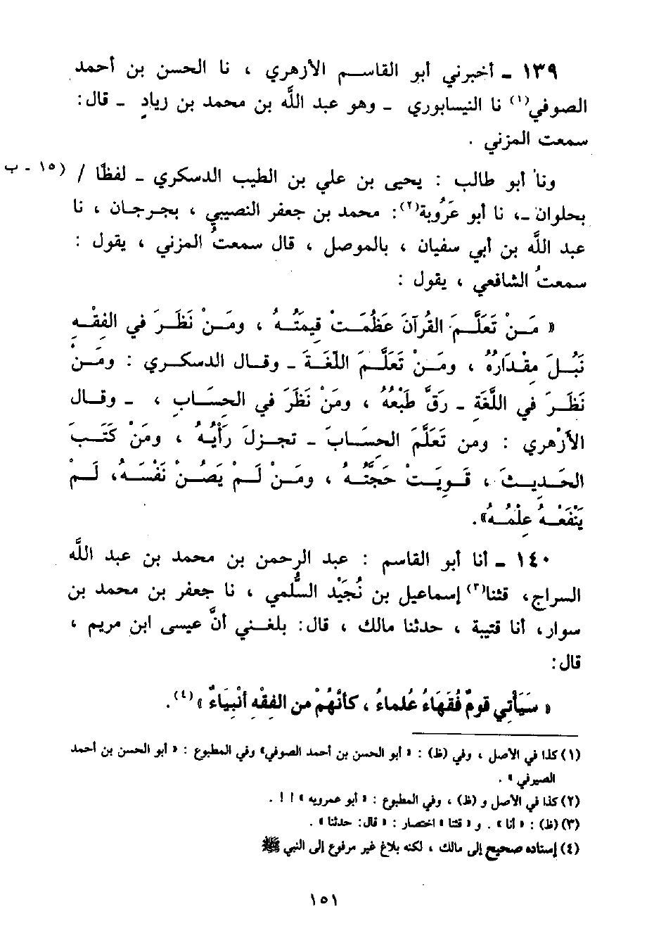 أَخْبَرَنِي أَبُو الْقَاسِمِ الْأَزْهَرِيُّ , نا الْحَسَنُ بْنُ أَحْمَدَ الصُّوفِيُّ , نا النَّيْسَابُورِيُّ وَهُوَ عَبْدُ اللَّهِ بْنُ مُحَمَّدِ بْنِ زِيَادٍ قَالَ: سَمِعْتُ الْمُزَنِيَّ , وَنَا أَبُو طَالِبٍ يَحْيَى بْنُ عَلِيِّ بْنِ الطَّيِّبِ الدَّسْكَرِيُّ لَفْظًا بِحُلْوَانَ , نا أَبُو عَرُوبَةَ مُحَمَّدُ بْنُ جَعْفَرٍ النَّصِيبِيُّ , بِجُرْجَانَ , نا عَبْدُ اللَّهِ بْنُ أَبِي سُفْيَانَ , بِالْمَوْصِلِ قَالَ سَمِعْتُ الْمُزَنِيَّ , يَقُولُ: سَمِعْتُ الشَّافِعِيَّ , يَقُولُ: «مَنْ تَعَلَّمَ الْقُرْآنَ عَظُمَتْ قِيمَتُهُ , وَمَنْ نَظَرَ فِي الْفِقْهِ نَبُلَ مِقْدَارُهُ , وَمَنْ تَعَلَّمَ اللُّغَةَ» - وَقَالَ الدَّسْكَرِيُّ: وَمَنْ نَظَرَ فِي اللُّغَةِ - «رَقَّ طَبْعُهُ , وَمَنْ نَظَرَ فِي الْحِسَابِ» , - وَقَالَ الْأَزْهَرِيُّ: وَمَنْ تَعَلَّمَ الْحِسَابِ - «تَجَزَّلَ رَأْيَهُ , وَمَنْ كَتَبَ الْحَدِيثَ قَوِيَتْ حَجَّتُهُ , وَمَنْ لَمْ يَصُنْ نَفْسَهُ , لَمْ يَنْفَعْهُ عَلِمُهُ»