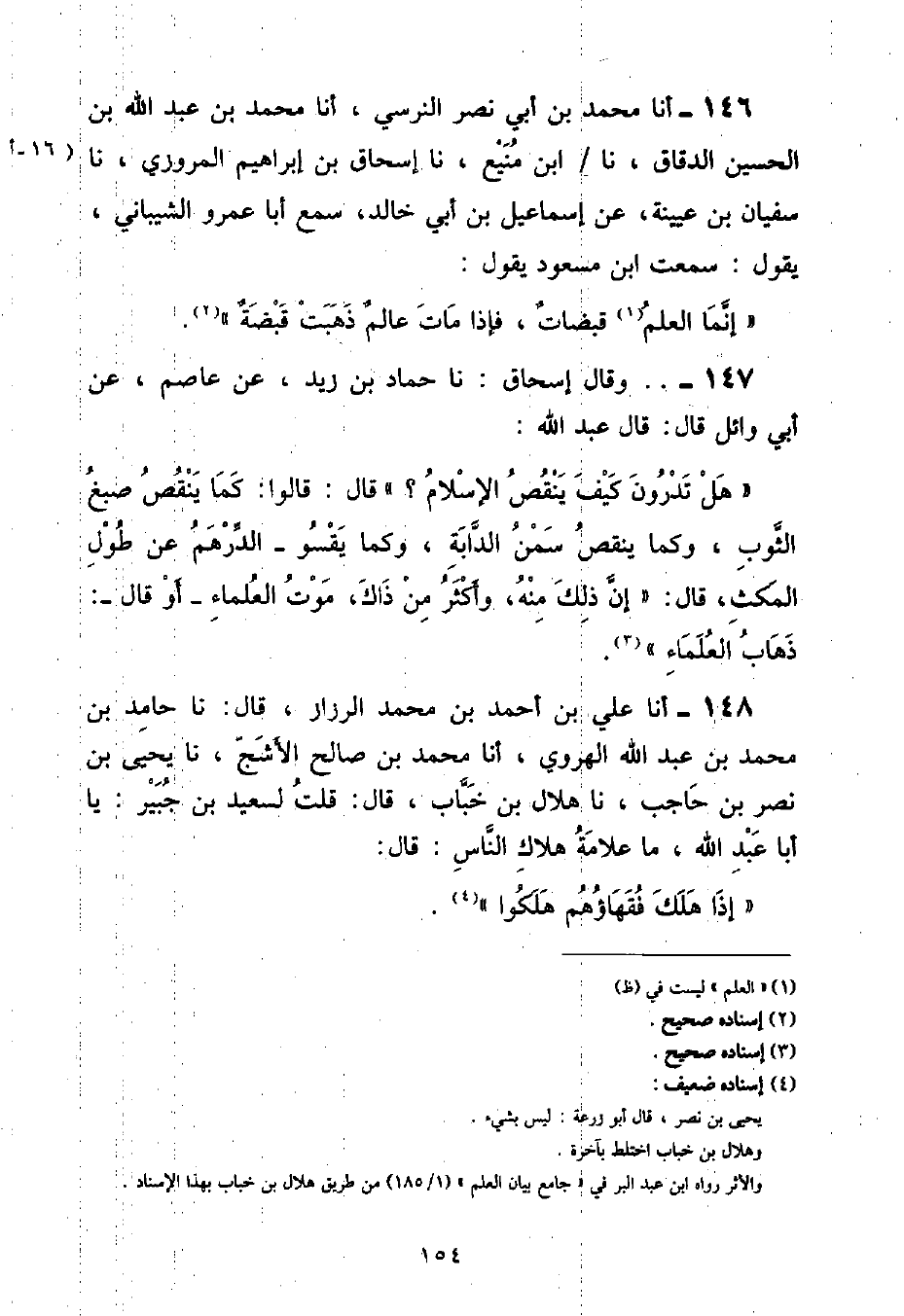 أنا مُحَمَّدُ بْنُ أَبِي نَصْرٍ النَّرْسِيُّ , أنا مُحَمَّدُ بْنُ عَبْدِ اللَّهِ بْنِ الْحُسَيْنِ الدَّقَّاقُ , نا ابْنُ مَنِيعٍ , نا إِسْحَاقُ بْنُ إِبْرَاهِيمَ الْمَرْوَزِيُّ , نا سُفْيَانُ بْنُ عُيَيْنَةَ , عَنْ إِسْمَاعِيلَ بْنِ أَبِي خَالِدٍ , سَمِعَ أَبَا عَمْرٍو الشَّيْبَانِيَّ , يَقُولُ: سَمِعْتُ ابْنَ مَسْعُودٍ , يَقُولُ: «إِنَّمَا الْعِلْمُ قَبَضَاتٌ , فَإِذَا مَاتَ عَالِمٌ ذَهَبَتْ قَبْضَةٌ»