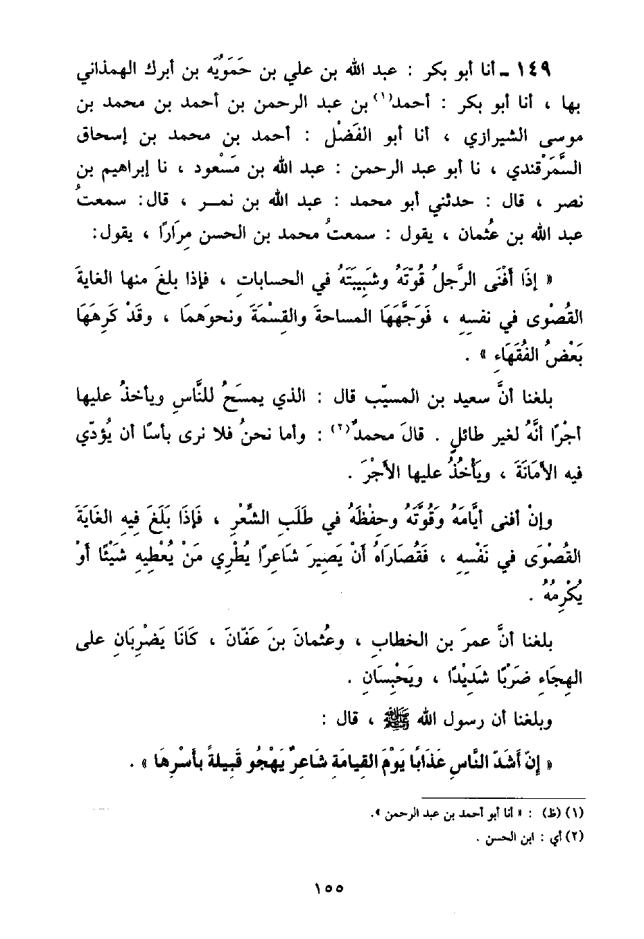 أنا أَبُو بَكْرٍ عَبْدُ اللَّهِ بْنُ عَلِيِّ بْنِ حَمُّوَيْهِ بْنِ أَبْرَكَ الْهَمَذَانِيُّ , بِهَا , أنا أَبُو بَكْرٍ أَحْمَدُ بْنُ عَبْدِ الرَّحْمَنِ بْنِ أَحْمَدَ بْنِ مُحَمَّدِ بْنِ مُوسَى الشِّيرَازِيُّ , أنا أَبُو الْفَضْلِ أَحْمَدُ بْنُ مُحَمَّدِ بْنِ إِسْحَاقَ السَّمَرْقَنْدِيُّ , نا أَبُو عَبْدِ الرَّحْمَنِ عَبْدُ اللَّهِ بْنُ مَسْعُودٍ , نا إِبْرَاهِيمُ بْنُ نَصْرٍ , قَالَ: حَدَّثَنِي أَبُو مُحَمَّدٍ عَبْدُ اللَّهِ بْنُ نَمِرٍ , قَالَ: سَمِعْتُ عَبْدَ اللَّهِ بْنَ عُثْمَانَ , يَقُولُ: سَمِعْتُ مُحَمَّدَ بْنَ الْحَسَنِ , مِرَارًا يَقُولُ: «إِذَا أَفْنَى الرَّجُلُ قُوَّتَهُ وَشَبِيبَتَهُ فِي الْحِسَابَاتِ , فَإِذَا بَلَغَ مِنْهَا الْغَايَةَ الْقُصْوَى فِي نَفْسِهِ , فَوَجَّهَهَا الْمِسَاحَةَ وَالْقِسْمَةَ وَنَحْوَهُمَا , وَقَدْ كَرِهَهَا بَعْضُ الْفُقَهَاءِ» بَلَغَنَا أَنَّ سَعِيدَ بْنَ الْمُسَيِّبِ قَالَ: الَّذِي يَمْسَحُ لِلنَّاسِ وَيَأْخُذُ عَلَيْهَا أَجْرًا أَنَّهُ لِغَيْرِ طَائِلٍ قَالَ مُحَمَّدٌ: وَأَمَّا نَحْنُ فَلَا نَرَى بَأْسًا أَنْ يُؤَدِّيَ فِيهِ الْأَمَانَةَ , وَيَأْخُذَ عَلَيْهَا الْأَجْرَ وَإِنْ أَفْنَى أَيَّامَهُ وَقُوَّتَهُ وَحِفْظَهُ فِي طَلَبِ الشَّعْرِ , فَإِذَا بَلَغَ فِيهِ الْغَايَةَ الْقُصْوَى فِي نَفْسِهِ , فَقُصَارَاهُ أَنْ يَصِيرَ شَاعِرًا يُطْرِي مَنْ يُعْطِيهِ شَيْئًا أَوْ يُكْرِمُهُ بَلَغَنَا أَنَّ عُمَرَ بْنَ الْخَطَّابِ وَعُثْمَانَ بْنَ عَفَّانَ كَانَا يَضْرِبَانِ عَلَى الْهِجَاءِ ضَرْبًا شَدِيدًا , وَيَحْبِسَانِ وَبَلَغَنَا أَنَّ رَسُولَ اللَّهِ صَلَّى اللهُ عَلَيْهِ وَسَلَّمَ قَالَ: إِنَّ أَشَدَّ النَّاسِ عَذَابًا يَوْمَ الْقِيَامَةِ شَاعِرٌ يَهْجُو قَبِيلَةً بِأَسْرِهَا