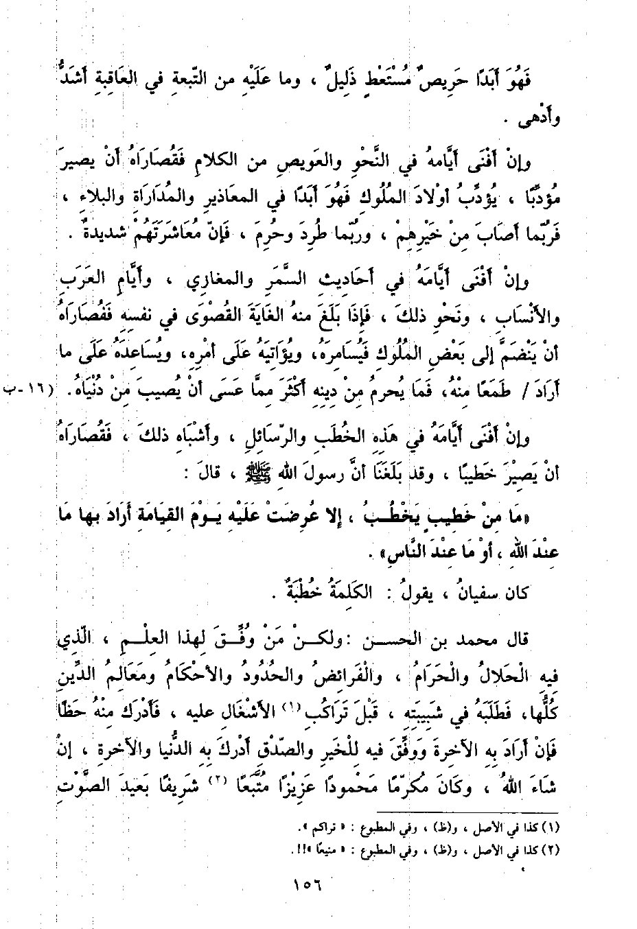 فَهُوَ أَبَدًا حَرِيصٌ مُسْتَعْطٍ ذَلِيلٌ , وَمَا عَلَيْهِ مِنَ التَّبِعَةِ فِي الْعَاقِبَةِ أَشَدُّ وَأَدْهَى وَإِنْ أَفْنَى أَيَّامَهُ فِي النَّحْوِ وَالْعَوِيصِ مِنَ الْكَلَامِ فَقُصَارَاهُ أَنْ يَصِيرَ مُؤَدِّبًا , يُؤَدِّبُ أَوْلَادَ الْمُلُوكِ فَهُوَ أَبَدًا فِي الْمَعَاذِيرِ وَالْمُدَارَاةِ وَالْبَلَاءِ , فَرُبَّمَا أَصَابَ مِنْ خَيْرِهِمْ , وَرُبَّمَا طُرِدَ وَحُرِمَ , فَإِنَّ مُعَاشَرَتَهُمْ شَدِيدَةٌ وَإِنْ أَفْنَى أَيَّامَهُ فِي أَحَادِيثِ السَّمَرِ وَالْمَغَازِي , وَأَيَّامِ الْعَرَبِ وَالْأَنْسَابِ , وَنَحْوِ ذَلِكَ , فَإِذَا بَلَغَ مِنْهُ الْغَايَةَ الْقُصْوَى فِي نَفْسِهِ فَقُصَارَاهُ أَنْ يَنْضَمَّ إِلَى بَعْضِ الْمُلُوكِ فَيُسَامِرَهُ , وَيُؤَاتِيَهُ عَلَى أَمْرِهِ , وَيُسَاعِدُهُ عَلَى مَا أَرَادَ طَمَعًا مِنْهُ , فَمَا يُحْرَمُ مِنْ دِينِهِ أَكْثَرُ مِمَّا عَسَى أَنْ يُصِيبَ مِنْ دُنْيَاهُ وَإِنْ أَفْنَى أَيَّامَهُ فِي هَذِهِ الْخُطَبِ وَالرَّسَائِلِ , وَأَشْبَاهِ ذَلِكَ , فَقُصَارَاهُ أَنْ يَصِيرَ خَطِيبًا , وَقَدْ بَلَغَنَا أَنَّ رَسُولَ اللَّهِ صَلَّى اللهُ عَلَيْهِ وَسَلَّمَ قَالَ: مَا مِنْ خَطِيبٍ يَخْطُبُ إِلَّا عُرِضَتْ عَلَيْهِ يَوْمَ الْقِيَامَةِ أَرَادَ بِهَا مَا عِنْدَ اللَّهِ , أَوْ مَا عِنْدَ النَّاسِ كَانَ سُفْيَانُ يَقُولُ: الْكَلِمَةُ خُطْبَةٌ