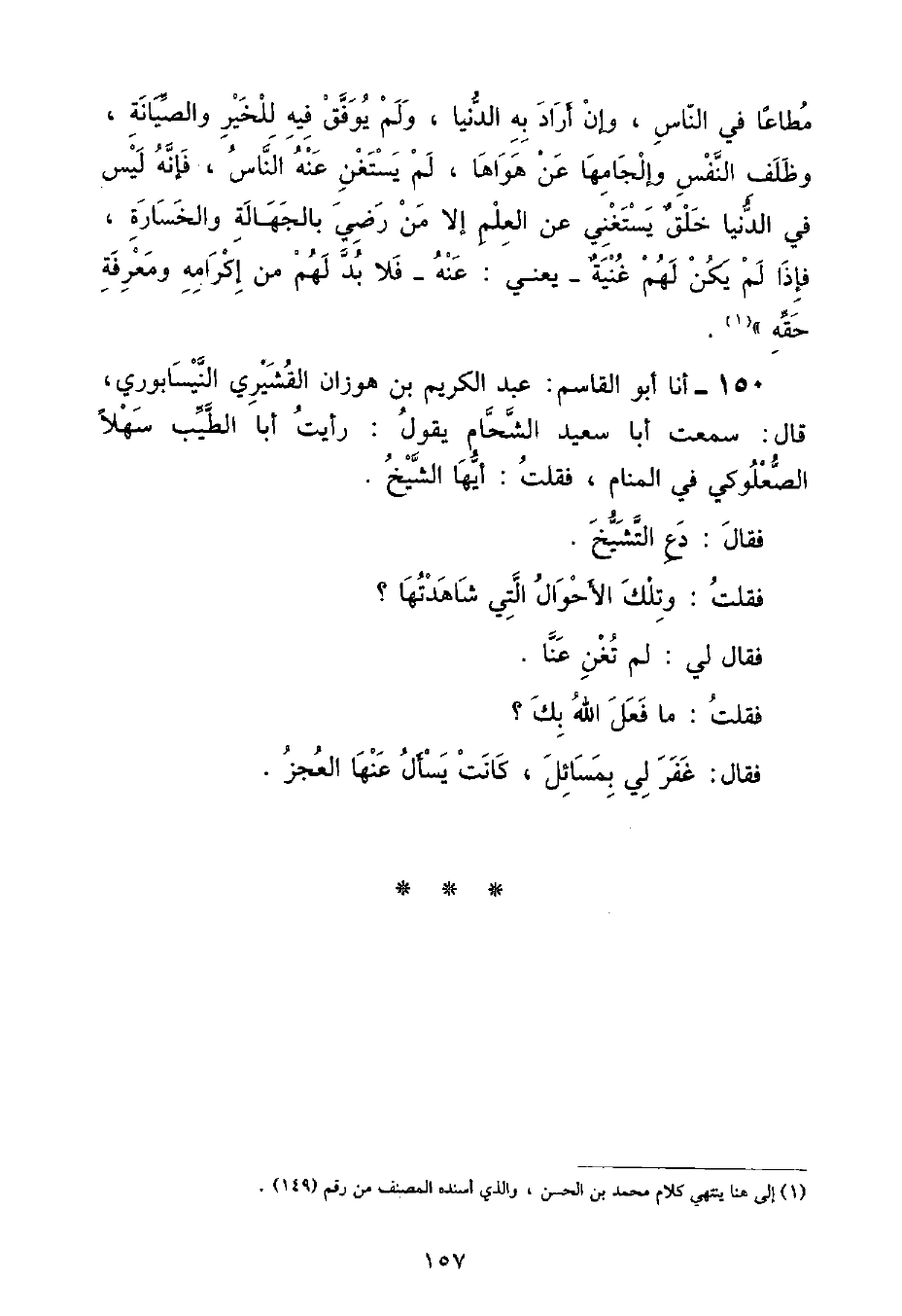 أنا أَبُو الْقَاسِمِ عَبْدُ الْكَرِيمِ بْنُ هَوَازِنَ الْقُشَيْرِيُّ النَّيْسَابُورِيُّ , قَالَ: سَمِعْتُ أَبَا سَعِيدٍ الشَّحَّامَ , يَقُولُ: " رَأَيْتُ أَبَا الطَّيِّبِ سَهْلًا الصُّعْلُوكِيَّ فِي الْمَنَامِ , فَقُلْتُ: أَيُّهَا الشَّيْخُ فَقَالَ: دَعِ التَّشَيُّخَ فَقُلْتُ: وَتِلْكَ الْأَحْوَالُ الَّتِي شَاهَدْتُهَا؟ فَقَالَ لِي: لَمْ تُغْنِ عَنَّا فَقُلْتُ: مَا فَعَلَ اللَّهُ بِكَ؟ فَقَالَ: غَفَرَ لِي بِمَسَائِلَ كَانَتْ يَسْأَلُ عَنْهَا الْعُجْزُ "