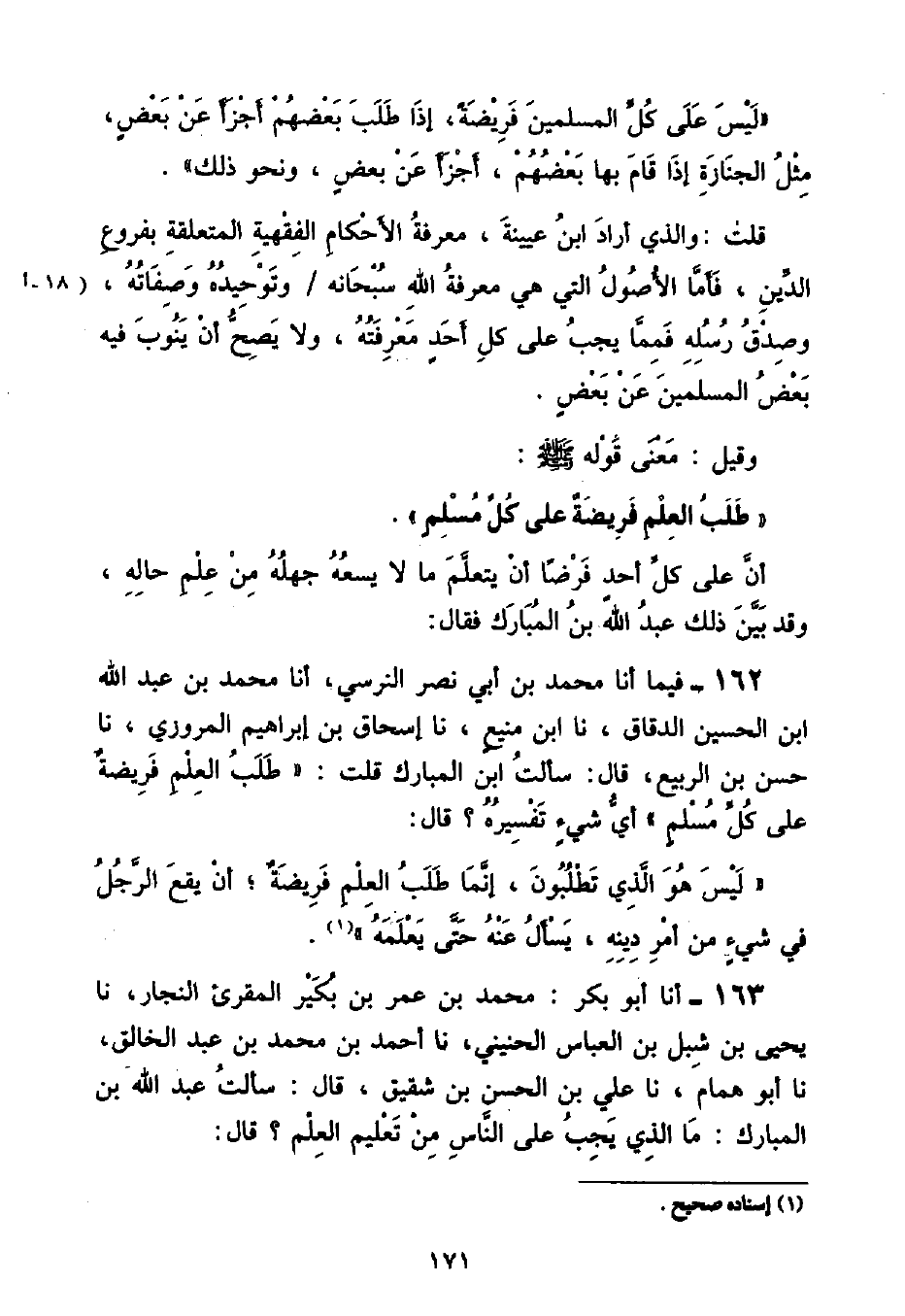وَقَدْ بَيَّنَ ذَلِكَ عَبْدُ اللَّهِ بْنُ الْمُبَارَكِ فَقَالَ: فِيمَا أنا مُحَمَّدُ بْنُ أَبِي نَصْرٍ النَّرْسِيُّ , أنا مُحَمَّدُ بْنُ عَبْدِ اللَّهِ بْنِ الْحُسَيْنِ الدَّقَّاقُ , نا ابْنُ مَنِيعٍ , نا إِسْحَاقُ بْنُ إِبْرَاهِيمَ الْمَرْوَزِيُّ , نا حَسَنُ بْنُ الرَّبِيعِ , قَالَ: سَأَلْتُ ابْنَ الْمُبَارَكِ قُلْتُ: طَلَبُ الْعِلْمِ فَرِيضَةٌ عَلَى كُلِّ مُسْلِمٍ " أَيُّ شَيْءٍ تَفْسِيرُهُ؟ قَالَ: «لَيْسَ هُوَ الَّذِي تَطْلُبُونَ , إِنَّمَا طَلَبُ الْعِلْمِ فَرِيضَةٌ أَنْ يَقَعَ الرَّجُلُ فِي شَيْءٍ مِنْ أَمْرِ دِينِهِ , يَسْأَلُ عَنْهُ حَتَّى يَعْلَمَهُ»