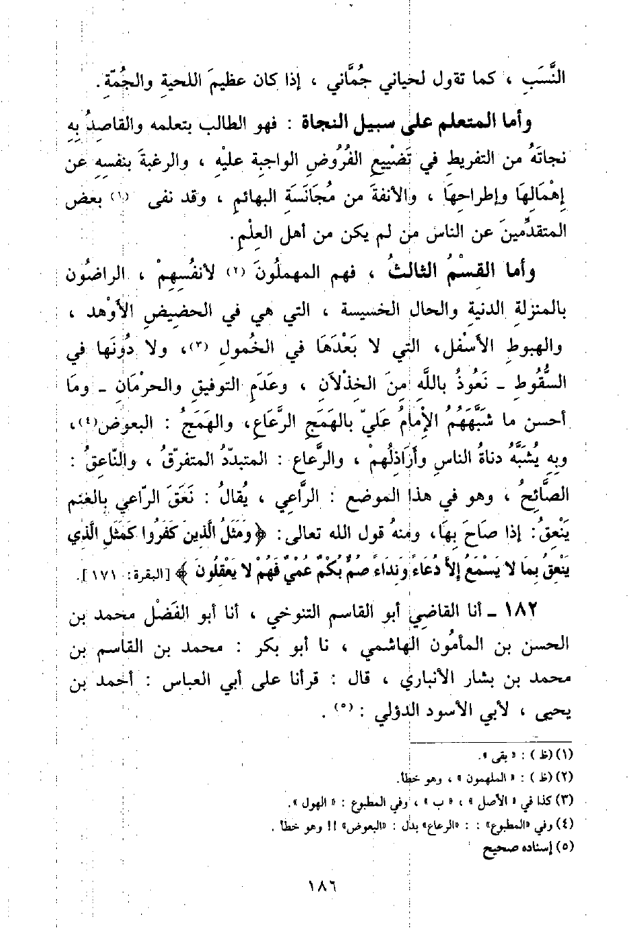 النَّسَبِ , كَمَا تَقُولُ: لِحْيَانِيُّ جُمَّانِيُّ , إِذَا كَانَ عَظِيمَ اللِّحْيَةِ وَالْجُمَّةِ وَأَمَّا الْمُتَعَلِّمُ عَلَى سَبِيلِ النَّجَاةِ: فَهُوَ الطَّالِبُ بِتَعَلُّمِهِ وَالْقَاصِدُ بِهِ نَجَاتَهُ مِنَ التَّفْرِيطِ فِي تَضْيِيعِ الْفُرُوضِ الْوَاجِبَةِ عَلَيْهِ , وَالرَّغْبَةِ بِنَفْسِهِ عَنْ إِهْمَالِهَا وَإِطْرَاحِهَا , وَالْأَنَفَةِ مِنْ مُجَانَسَةِ الْبَهَائِمِ , وَقَدْ نَفَى بَعْضُ الْمُتَقَدِّمِينَ عَنِ النَّاسِ مَنْ لَمْ يَكُنْ مِنْ أَهْلِ الْعِلْمِ وَأَمَّا الْقَسَمُ الثَّالِثُ , فَهُمُ الْمُهْمِلُونَ لِأَنْفُسِهِمْ , الرَّاضُونَ بِالْمَنْزِلَةِ الدَّنِيَّةِ وَالْحَالِ الْخَسِيسَةِ , الَّتِي هِيَ فِي الْحَضِيضِ الْأَوْهَدِ , وَالْهُبُوطِ الْأَسْفَلِ , الَّتِي لَا بَعْدَهَا فِي الْخُمُولِ , وَلَا دُونَهَا فِي السُّقُوطِ - نَعُوذُ بِاللَّهِ مِنَ الْخَذَلَانِ , وَعَدَمِ التَّوْفِيقِ وَالْحِرْمَانِ - وَمَا أَحْسَنَ مَا شَبَّهَهُمُ الْإِمَامُ عَلِيٌّ بِالْهَمَجِ الرَّعَاعِ: وَالهَمَجُ: البَعُوضُ , وَبِهِ يُشَبَّهُ دُنَاةُ النَاسِ وَأَرَاذِلُهُم، وَالرِّعَاعُ: الْمُتَبَدِّدِ الْمُتَفَرِّقِ , وَالنَّاعِقُ: الصَّائِحُ , وَهُوَ فِي هَذَا الْمَوْضِعِ: الرَّاعِي , يُقَالُ: نَعَقَ الرَّاعِي بِالْغَنَمِ يَنْعِقُ: إِذَا صَاحَ بِهَا , وَمِنْهُ قَوْلُ اللَّهِ تَعَالَى: {وَمَثَلُ الَّذِينَ كَفَرُوا كَمَثَلِ الَّذِي يَنْعِقُ بِمَا لَا يَسْمَعُ إِلَّا دُعَاءً وَنِدَاءً صُمٌّ بُكْمٌ عُمْيٌ فَهُمْ لَا يَعْقِلُونَ} [البقرة: ١٧١]