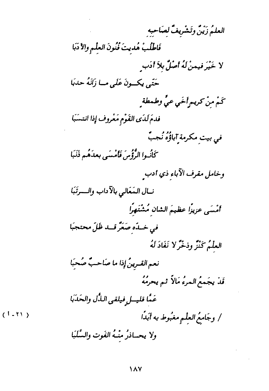 الْعِلْمُ زَيْنٌ وَتَشْرِيفٌ لِصَاحِبِهِ ... فَاطْلُبْ هُدِيتَ فُنُونَ الْعِلْمِ وَالْأَدَبَا