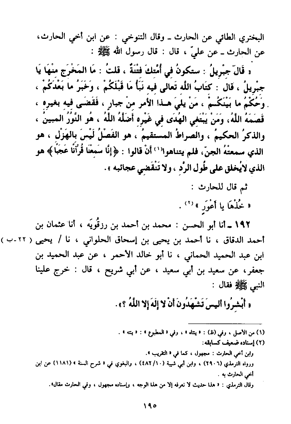 أنا أَبُو الْحَسَنِ , مُحَمَّدُ بْنُ أَحْمَدَ بْنِ رِزْقَوَيْهِ , أنا عُثْمَانُ بْنُ أَحْمَدَ الدَّقَّاقُ , نا أَحْمَدُ بْنُ يَحْيَى بْنِ إِسْحَاقَ الْحُلْوَانِيُّ , نا يَحْيَى بْنُ عَبْدِ الْحَمِيدِ الْحِمَّانِيُّ , نا أَبُو خَالِدٍ الْأَحْمَرُ , عَنْ عَبْدِ الْحَمِيدِ بْنِ جَعْفَرٍ , عَنْ سَعِيدِ بْنِ أَبِي سَعِيدٍ , عَنْ أَبِي شُرَيْحٍ , قَالَ: خَرَجَ عَلَيْنَا النَّبِيُّ صَلَّى اللهُ عَلَيْهِ وَسَلَّمَ فَقَالَ: «أَبْشِرُوا أَلَيْسَ تَشْهَدُونَ أَنْ لَا إِلَهَ إِلَّا اللَّهُ؟» ⦗١٩٦⦘ قَالُوا: نَعَمْ قَالَ: «فَإِنَّ هَذَا الْقُرْآنَ سَبَبٌ طَرْفُهُ بِيَدِ اللَّهِ تَعَالَى , وَطَرَفُهُ بِأَيْدِيكُمْ , فَتَمَسَّكُوا بِهِ , فَإِنَّكُمْ لَنْ تَضِلُّوا وَلَنْ تَهْلَكُوا بَعْدَهُ أَبَدًا»