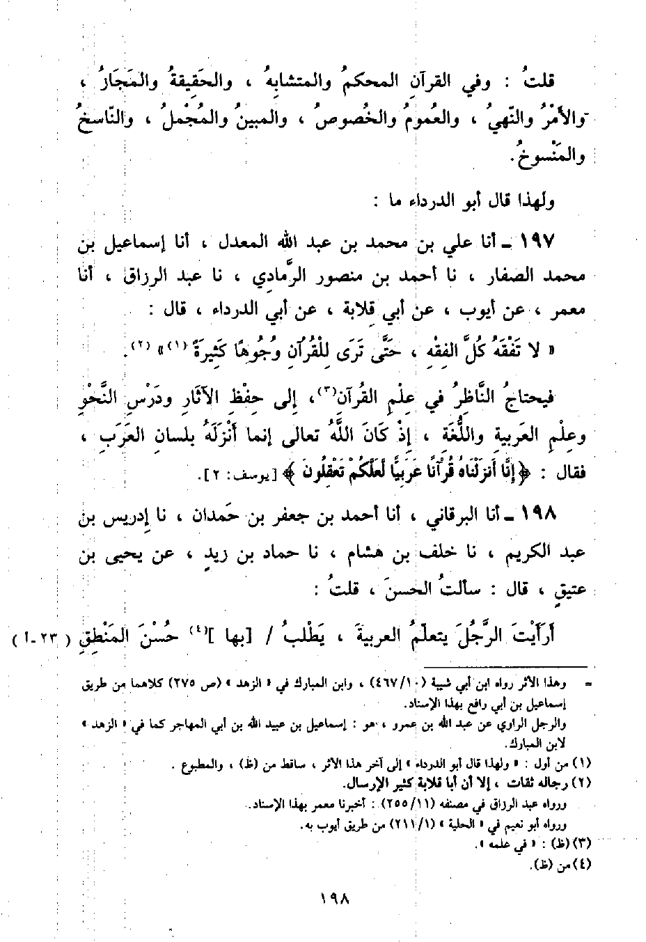 وَلِهَذَا قَالَ أَبُو الدَّرْدَاءٍ مَا: أنا عَلِيُّ بْنُ مُحَمَّدِ بْنِ عَبْدِ اللَّهِ الْمُعَدِّلُ , أنا إِسْمَاعِيلُ بْنُ مُحَمَّدٍ الصَّفَّارُ , نا أَحْمَدُ بْنُ مَنْصُورٍ الرَّمَادِيُّ , نا عَبْدُ الرَّزَّاقِ , أنا مَعْمَرٌ , عَنْ أَيُّوبَ , عَنْ أَبِي قِلَابَةَ , عَنْ أَبِي الدَّرْدَاءِ , قَالَ: " لَا تَفْقَهُ كُلَّ الْفِقْهِ , حَتَّى تَرَى لِلْقُرْآنِ وُجُوهًا كَثِيرَةً فَيَحْتَاجُ النَّاظِرُ فِي عِلْمِ الْقُرْآنِ , إِلَى حِفْظِ الْآثَارِ وَدَرْسِ النَّحْوِ وَعِلْمِ الْعَرَبِيَّةِ وَاللُّغَةِ , إِذْ كَانَ اللَّهُ تَعَالَى إِنَّمَا أَنْزَلَهُ بِلِسَانِ الْعَرَبِ , فَقَالَ: {إِنَّا أَنْزَلْنَاهُ قُرْآنًا عَرَبِيًّا لَعَلَّكُمْ تَعْقِلُونَ} [يوسف: ٢]