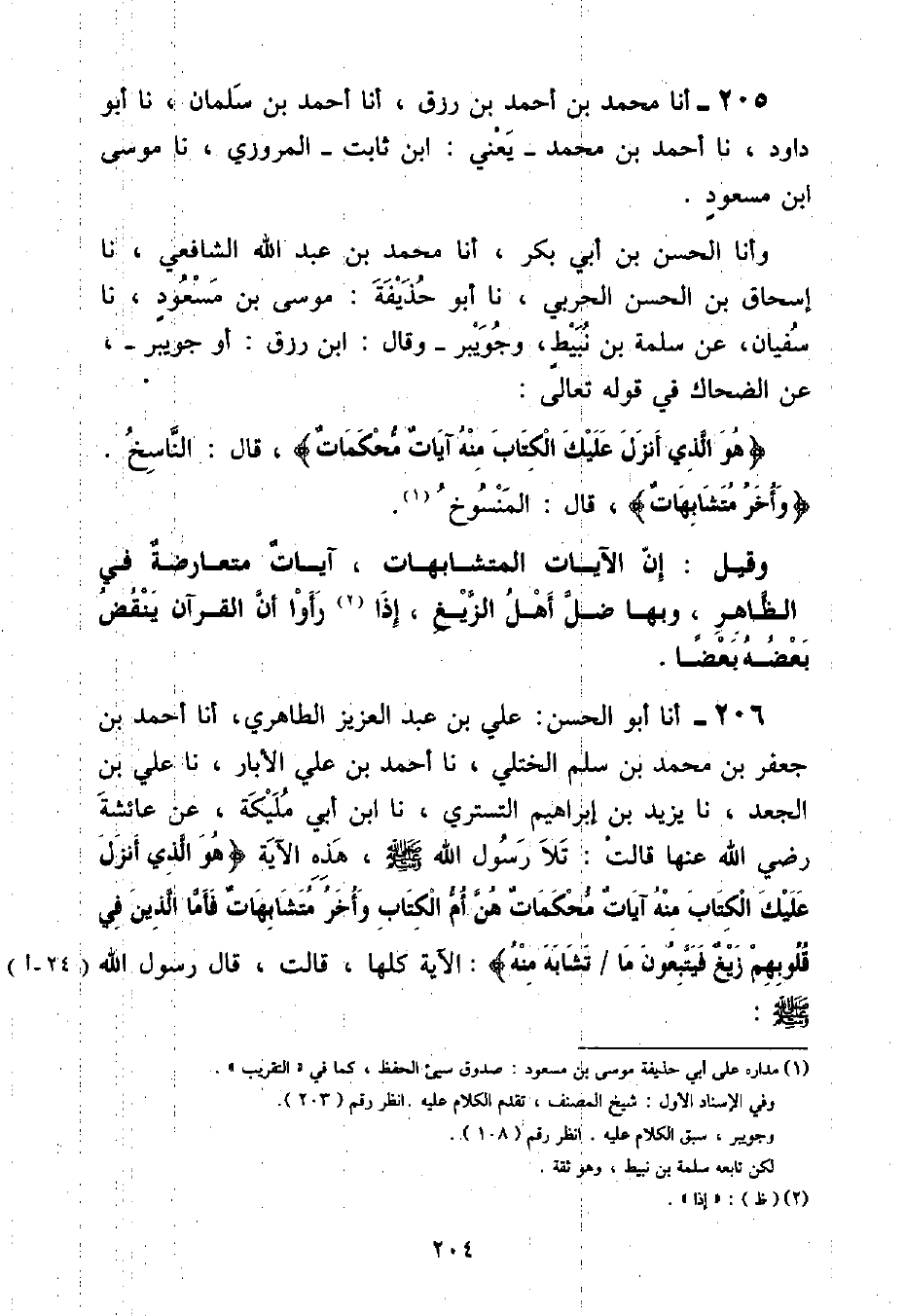 أنا مُحَمَّدُ بْنُ أَحْمَدَ بْنِ رِزْقٍ , أنا أَحْمَدُ بْنُ سَلْمَانَ , نا أَبُو دَاوُدَ , نا أَحْمَدُ بْنُ مُحَمَّدٍ يَعْنِي ابْنَ ثَابِتٍ الْمَرْوَزِيَّ , نا مُوسَى بْنُ مَسْعُودٍ , وَأَنَا الْحَسَنُ بْنُ أَبِي بَكْرٍ , أنا مُحَمَّدُ بْنُ عَبْدِ اللَّهِ الشَّافِعِيُّ , نا إِسْحَاقُ بْنُ الْحَسَنِ الْحَرْبِيُّ , نا أَبُو حُذَيْفَةَ مُوسَى بْنُ مَسْعُودٍ , نا سُفْيَانُ , عَنْ سَلَمَةَ بْنِ نُبَيْطٍ , وجُوَيْبِرَ , - وَقَالَ: ابْنُ رِزْقٍ: أَوْ جُوَيْبِرَ - , عَنِ الضَّحَّاكِ , فِي قَوْلِهِ تَعَالَى: {هُوَ الَّذِي أَنْزَلَ عَلَيْكَ الْكِتَابَ مِنْهُ آيَاتٌ مُحْكَمَاتٌ} [آل عمران: ٧] قَالَ: «النَّاسِخُ» {وَأُخَرُ مُتَشَابِهَاتٌ} [آل عمران: ٧] قَالَ: «الْمَنْسُوخُ» وَقِيلَ إِنَّ الْآيَاتِ االْمُتَشَابِهَاتِ , آيَاتٌ مُتَعَارِضَةٌ فِي الظَّاهِرِ , وَبِهَا ضَلَّ أَهْلُ الزَّيْغِ , إِذَا رَأَوْا أَنَّ الْقُرْآنَ يَنْقُضُ بَعْضُهُ بَعْضًا