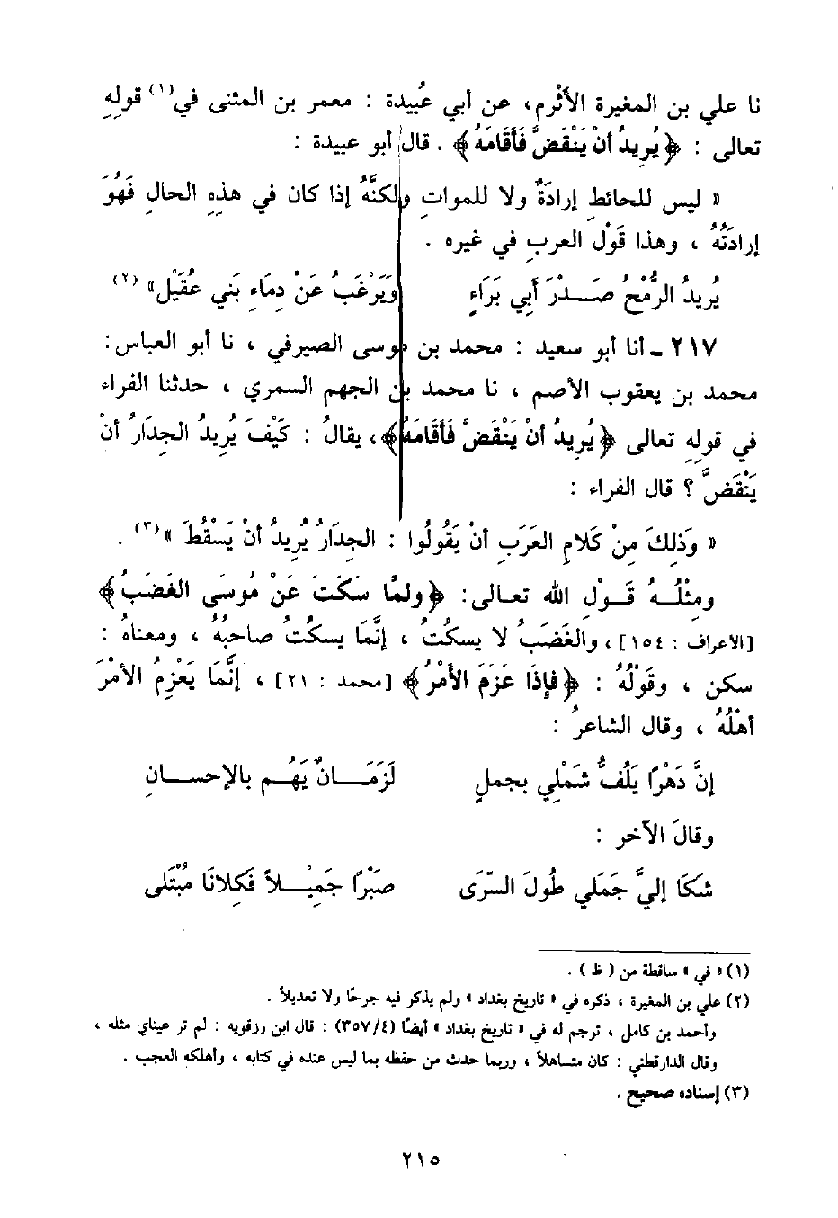 أنا أَبُو سَعِيدٍ مُحَمَّدُ بْنُ مُوسَى الصَّيْرَفِيُّ , نا أَبُو الْعَبَّاسِ مُحَمَّدُ بْنُ يَعْقُوبَ الْأَصَمُّ , نا مُحَمَّدُ بْنُ الْجَهْمِ السَّمُرِيُّ , حَدَّثَنَا الْفَرَّاءُ , فِي قَوْلِهِ تَعَالَى {يُرِيدُ أَنْ يَنْقَضَّ فَأَقَامَهُ} [الكهف: ٧٧] , يُقَالُ: كَيْفَ يُرِيدُ الْجِدَارُ أَنْ يَنْقَضَّ؟ قَالَ الْفَرَّاءُ: " وَذَلِكَ مِنْ كَلَامِ الْعَرَبِ أَنْ يَقُولُوا: الْجِدَارُ يُرِيدُ أَنْ يَسْقُطَ" وَمِثْلُهُ قَوْلُ اللَّهِ تَعَالَى: {وَلَمَّا سَكَتَ عَنْ مُوسَى الْغَضَبُ} [الأعراف: ١٥٤] , وَالْغَضَبُ لَا يَسْكُتُ , إِنَّمَا يَسْكُتُ صَاحِبُهُ , وَمَعْنَاهُ: سَكَنَ , وَقَوْلُهُ: {فَإِذَا عَزَمَ الْأَمْرُ} [محمد: ٢١] , إِنَّمَا يَعْزِمُ الْأَمْرَ أَهْلُهُ , وَقَالَ الشَّاعِرُ: