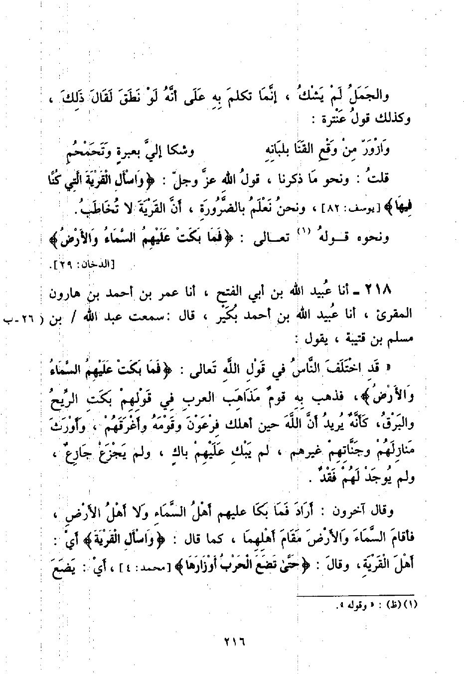 أنا عُبَيْدُ اللَّهِ بْنُ أَبِي الْفَتْحِ , أنا عُمَرُ بْنُ أَحْمَدَ بْنِ هَارُونَ الْمُقْرِئُ , أنا عُبَيْدُ اللَّهِ بْنُ أَحْمَدَ بُكَيْرٌ قَالَ: سَمِعْتُ عَبْدَ اللَّهِ بْنَ مُسْلِمِ بْنِ قُتَيْبَةَ , يَقُولُ: " قَدِ اخْتَلَفَ النَّاسُ فِي قَوْلِ اللَّهِ تَعَالَى: {فَمَا بَكَتْ عَلَيْهِمُ السَّمَاءُ وَالْأَرْضُ} [الدخان: ٢٩] , فَذَهَبَ بِهِ قَوْمٌ مَذَاهِبَ الْعَرَبِ فِي قَوْلِهِمْ بَكَتِ الرِّيحُ وَالْبَرْقُ , كَأَنَّهُ يُرِيدُ أَنَّ اللَّهَ حِينَ أَهْلَكَ فِرْعَوْنَ وَقَوْمَهُ وَأَغْرَقَهُمْ , وَأَوْرَثَ مَنَازِلَهُمْ وَجَنَّاتِهِمْ غَيْرَهُمْ , لَمْ يَبْكِ عَلَيْهِمْ بَاكٍ , وَلَمْ يَجْزَعْ جَازِعٌ , وَلَمْ يُوجَدْ لَهُمْ فَقْدٌ وَقَالَ آخَرُونَ: أَرَادَ فَمَا بَكَا عَلَيْهِمْ أَهْلُ السَّمَاءِ وَلَا أَهْلُ الْأَرْضِ , فَأَقَامَ السَّمَاءَ وَالْأَرْضَ مَقَامَ أَهْلِهِمَا , كَمَا قَالَ: {وَاسْأَلِ الْقَرْيَةَ} [يوسف: ٨٢] أَيْ: أَهْلَ الْقَرْيَةِ , وَقَالَ: {حَتَّى تَضَعَ الْحَرْبُ أَوْزَارَهَا} [محمد: ٤] , أَيْ: يَضَعَ