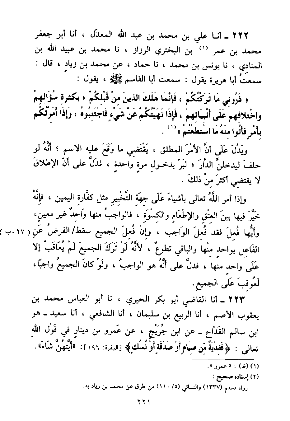 أنا عَلِيُّ بْنُ مُحَمَّدِ بْنِ عَبْدِ اللَّهِ الْمُعَدِّلُ , أنا أَبُو جَعْفَرٍ , مُحَمَّدُ بْنُ عُمَرَ بْنِ الْبَخْتَرِيِّ الرَّزَّازُ , نا مُحَمَّدُ بْنُ عُبَيْدِ اللَّهِ بْنِ الْمُنَادِي , نا يُونُسُ بْنُ مُحَمَّدٍ , نا حَمَّادٌ , عَنْ مُحَمَّدِ بْنِ زِيَادٍ , قَالَ: سَمِعْتُ أَبَا هُرَيْرَةَ , يَقُولُ: سَمِعْتُ أَبَا الْقَاسِمِ , صَلَّى اللهُ عَلَيْهِ وَسَلَّمَ يَقُولُ: «ذَرُونِي مَا تَرَكْتُكُمْ , فَإِنَّمَا هَلَكَ الَّذِينَ مِنْ قَبْلِكُمْ , بِكَثْرَةِ سُؤَالِهِمْ وَاخْتِلَافِهِمْ عَلَى أَنْبِيَائِهِمْ , فَإِذَا نَهَيْتُكُمْ عَنْ شَيْءٍ فَاجْتَنِبُوهُ , وَإِذَا أَمَرْتُكُمْ بِأَمْرٍ فَأَتَوْا مِنْهُ مَا اسْتَطَعْتُمْ» وَيَدُلُّ عَلَى أَنَّ الْأَمْرَ الْمُطْلَقَ يَقْتَضِي مَا وَقَعَ عَلَيْهِ الِاسْمُ , أَنَّهُ لَوْ حَلَفَ لَيَدْخُلَنَّ الدَّارَ لَبَرَّ بِدُخُولِ مَرَّةٍ وَاحِدَةٍ , فَدُلَّ عَلَى أَنَّ الْإِطْلَاقَ لَا يَقْتَضِي أَكْثَرَ مِنْ ذَلِكَ وَإِذَا أَمَرَ اللَّهُ تَعَالَى بِأَشْيَاءَ عَلَى جِهَةِ التَّخْيِيرِ مِثْلِ كَفَّارَةِ الْيَمِينِ , فَإِنَّهُ خَيَّرَ فِيهَا بَيْنَ الْعِتْقِ وَالْإِطْعَامِ وَالْكُسْوَةِ , فَالْوَاجِبُ مِنْهَا وَاحِدٌ غَيْرُ مُعَيَّنٍ , وَأَيُّهَا فَعَلَ فَقَدْ فَعَلَ الْوَاجِبَ , وَإِنْ فَعَلَ الْجَمِيعُ سَقَطَ الْفَرْضُ عَنِ الْفَاعِلَ بِوَاحِدٍ مِنْهَا وَالْبَاقِي تَطَوُّعٌ , لِأَنَّهُ لَوْ تَرَكَ الْجَمِيعَ لَمْ يُعَاقَبْ إِلَّا عَلَى وَاحِدٍ مِنْهَا , فَدَلَّ عَلَى أَنَّهُ هُوَ الْوَاجِبُ , وَلَوْ كَانَ الْجَمِيعُ وَاجِبًا , لَعُوقِبَ عَلَى الْجَمِيعِ