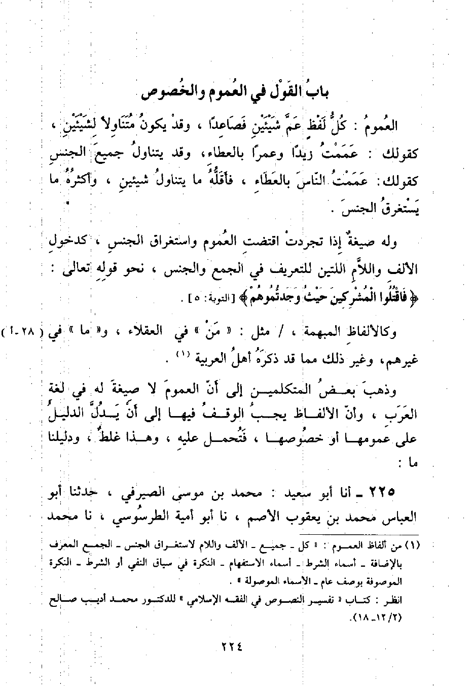 بَابُ الْقَوْلِ فِي الْعُمُومِ وَالْخُصُوصِ الْعُمُومُ: كُلُّ لَفْظٍ عَمَّ شَيْئَيْنِ فَصَاعِدًا , وَقَدْ يَكُونُ مُتَنَاوِلًا لِشَيْئَيْنِ , كَقَوْلِكَ: عَمَمْتُ زَيْدًا وَعَمْرًا بِالْعَطَاءِ , وَقَدْ يَتَنَاوَلُ جَمِيعَ الْجِنْسِ كَقَوْلِكَ: عَمَمْتُ النَّاسَ بِالْعَطَاءِ , فَأَقَلُّهُ مَا يَتَنَاوَلُ شَيْئَيْنِ , وَأَكْثَرُهُ مَا يَسْتَغْرِقُ الْجِنْسَ وَلَهُ صِيغَةٌ إِذَا تَجَرَّدَتِ اقْتَضَتِ الْعُمُومَ وَاسْتِغْرَاقَ الْجِنْسِ كَدُخُولِ الْأَلِفِ وَاللَّامِ اللَّتَيْنِ لِلتَّعْرِيفِ فِي الْجَمْعِ وَالْجِنْسِ , نَحْوُ قَوْلِهِ تَعَالَى: {فَاقْتُلُوا الْمُشْرِكِينَ حَيْثُ وَجَدْتُمُوهُمْ} [التوبة: ٥] وَكَالْأَلْفَاظِ الْمُبْهَمَةِ مِثْلِ: (مَنْ) فِي الْعُقَلَاءِ , وَ (مَا) فِي غَيْرِهِمْ , وَغَيْرِ ذَلِكَ مِمَّا قَدْ ذَكَرَهُ أَهْلُ الْعَرَبِيَّةِ وَذَهَبَ بَعْضُ الْمُتَكَلِّمِينَ إِلَى أَنَّ الْعُمُومَ لَا صِيغَةَ لَهُ فِي لُغَةِ الْعَرَبِ , وَأَنَّ الْأَلْفَاظَ يَجِبُ الْوَقْفُ فِيهَا إِلَى أَنْ يَدُلَّ الدَّلِيلُ عَلَى عُمُومِهَا أَوْ خُصُوصِهَا , فَتَحْمِلُ عَلَيْهِ , وَهَذَا غَلَطٌ , وَدَلِيلُنَا مَا: