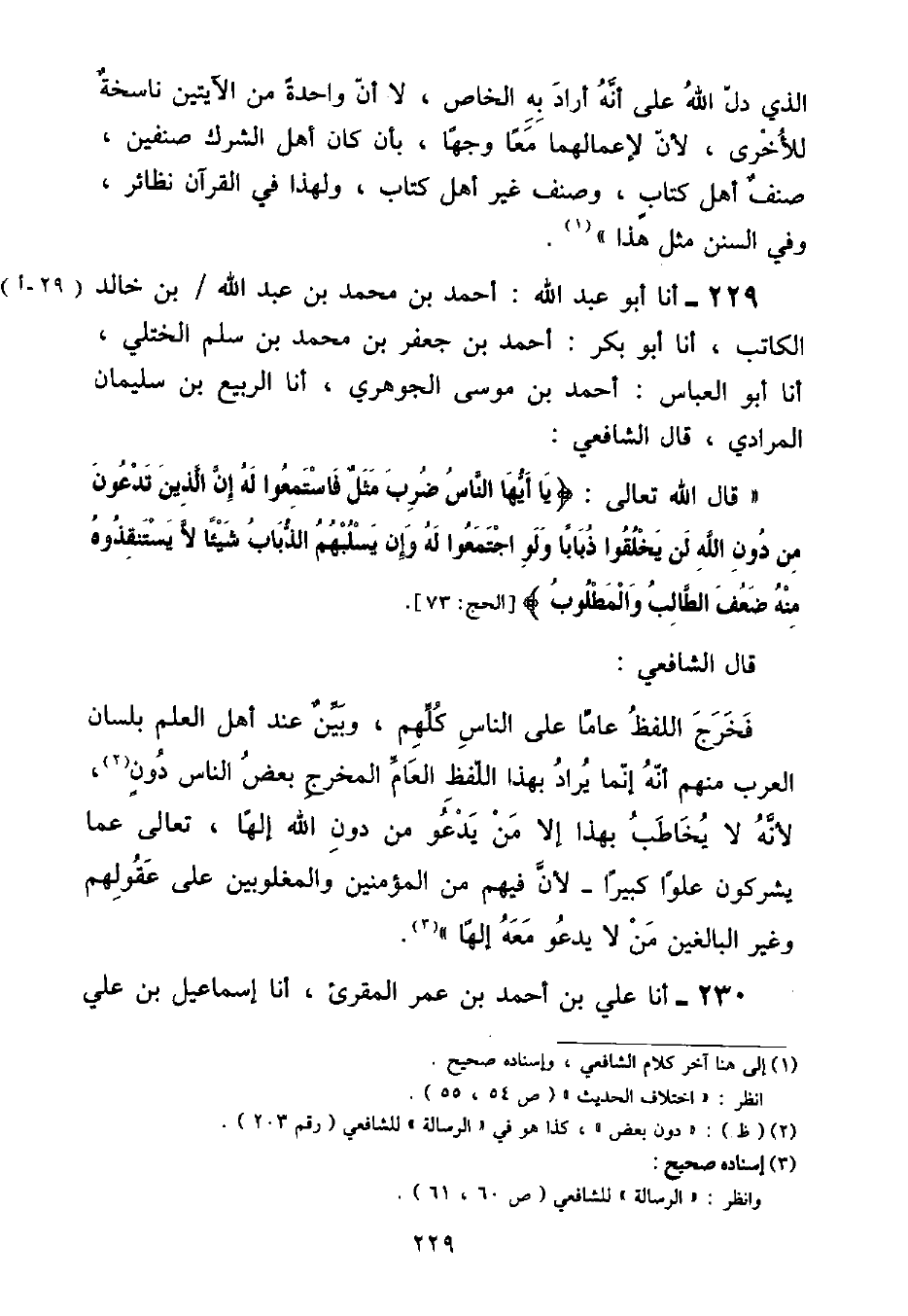 أنا أَبُو عَبْدِ اللَّهِ , أَحْمَدُ بْنُ مُحَمَّدِ بْنِ عَبْدِ اللَّهِ بْنِ خَالِدٍ الْكَاتِبُ , أنا أَبُو بَكْرٍ , أَحْمَدُ بْنُ جَعْفَرِ بْنِ مُحَمَّدِ بْنِ سَلْمٍ الْخُتَّلِيُّ , أنا أَبُو الْعَبَّاسِ , أَحْمَدُ بْنُ مُوسَى الْجَوْهَرِيُّ , أنا الرَّبِيعُ بْنُ سُلَيْمَانَ الْمُرَادِيُّ , قَالَ الشَّافِعِيُّ: قَالَ اللَّهُ تَعَالَى: {يَا أَيُّهَا النَّاسُ ضُرِبَ مَثَلٌ فَاسْتَمِعُوا لَهُ إِنَّ الَّذِينَ تَدْعُونَ مِنْ دُونِ اللَّهِ لَنْ يَخْلُقُوا ذُبَابًا وَلَوِ اجْتَمَعُوا لَهُ وَإِنْ يَسْلُبْهُمُ الذُّبَابُ شَيْئًا لَا يَسْتَنْقِذُوهُ مِنْهُ ضَعُفَ الطَّالِبُ وَالْمَطْلُوبُ} [الحج: ٧٣] قَالَ الشَّافِعِيُّ: «فَخَرَجَ اللَّفْظُ عَامًا عَلَى النَّاسِ كُلِّهِمْ , وَبَيِّنٌ عِنْدَ أَهْلِ الْعِلْمِ بِلِسَانِ الْعَرَبِ مِنْهُمْ أَنَّهُ إِنَّمَا يُرَادُ بِهَذَا اللَّفْظِ الْعَامِ الْمُخْرِجِ بَعْضَ النَّاسِ دُونَ بَعْضٍ , لِأَنَّهُ لَا يُخَاطَبُ بِهَذَا إِلَّا مَنْ يَدْعُو مِنْ دُونِ اللَّهِ إِلَهًا , تَعَالَى عَمَّا يُشْرِكُونَ عُلُوًّا كَبِيرًا - لِأَنَّ فِيهِمْ مِنَ الْمُؤْمِنِينَ وَالْمَغْلُوبِينَ عَلَى عُقُولِهِمْ وَغَيْرِ الْبَالِغِينَ مَنْ لَا يَدْعُو مَعَهُ إِلَهًا»