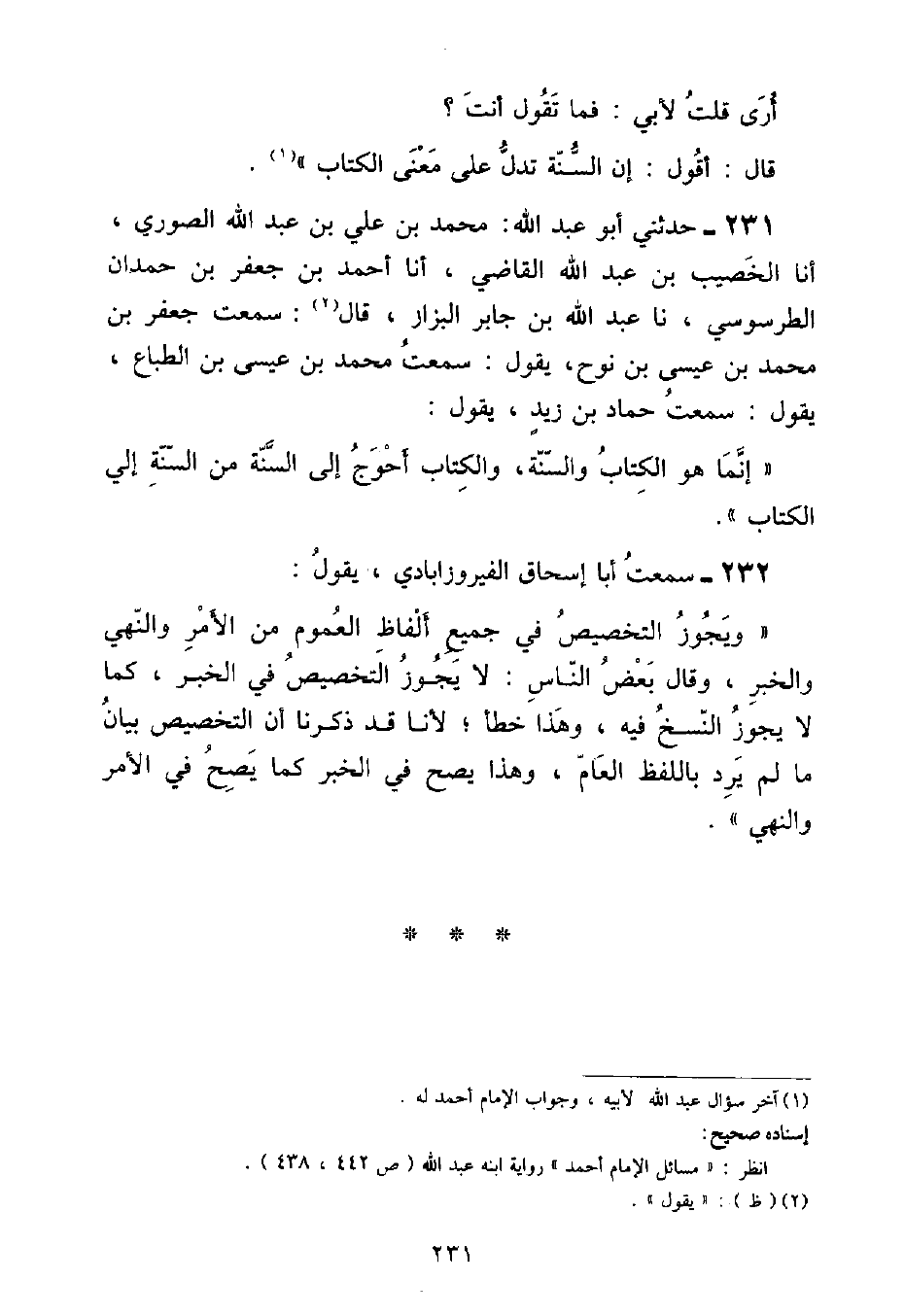 حَدَّثَنِي أَبُو عَبْدِ اللَّهِ مُحَمَّدُ بْنُ عَلِيِّ بْنِ عَبْدِ اللَّهِ الصُّورِيُّ , أنا الْخَصِيبُ بْنُ عَبْدِ اللَّهِ الْقَاضِي , أنا أَحْمَدُ بْنُ جَعْفَرِ بْنِ حَمْدَانَ الطُّرَسُوسِيُّ , نا عَبْدُ اللَّهِ بْنُ جَابِرٍ الْبَزَّازُ , قَالَ: سَمِعْتُ جَعْفَرَ بْنَ مُحَمَّدِ بْنِ عِيسَى بْنِ نُوحٍ , يَقُولُ: سَمِعْتُ مُحَمَّدَ بْنَ عِيسَى بْنِ الطَّبَّاعِ , يَقُولُ: سَمِعْتُ حَمَّادَ بْنَ زَيْدٍ , يَقُولُ: «إِنَّمَا هُوَ الْكِتَابُ وَالسُّنَّةُ , وَالْكِتَابُ أَحْوَجُ إِلَى السُّنَّةِ مِنَ السُّنَّةِ إِلَى الْكِتَابِ» سَمِعْتُ أَبَا إِسْحَاقَ الْفَيْرُوزَابَادِيَّ , يَقُولُ: وَيَجُوزُ التَّخْصِيصُ فِي جَمِيعِ أَلْفَاظِ الْعُمُومِ مِنَ الْأَمْرِ وَالنَّهْيِ وَالْخَبَرِ , وَقَالَ بَعْضُ النَّاسِ: لَا يَجُوزُ التَّخْصِيصُ فِي الْخَبَرِ , كَمَا لَا يَجُوزُ النَّسْخُ فِيهِ , وَهَذَا خَطَأٌ , لَأَنَّا قَدْ ذَكَرْنَا أَنَّ التَّخْصِيصَ بَيَانُ مَا لَمْ يَرِدْ بِاللَّفْظِ الْعَامِّ وَهَذَا قَدْ يَصِحُّ فِي الْخَبَرِ كَمَا يَصِحُّ فِي الْأَمْرِ وَالنَّهْيِ