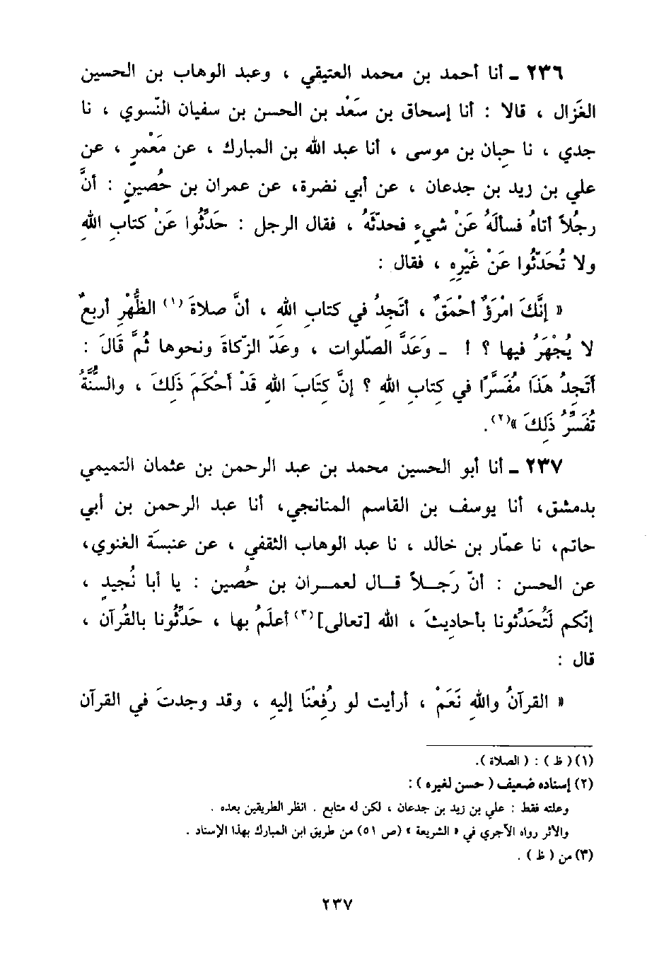 أنا أَحْمَدُ بْنُ مُحَمَّدٍ الْعَتِيقِيُّ , وَعَبْدُ الْوَهَّابِ بْنُ الْحُسَيْنِ الْغَزَّالُ , قَالَا: أنا إِسْحَاقُ بْنُ سَعْدِ بْنِ الْحَسَنِ بْنِ سُفْيَانَ النَّسَوِيُّ , نا جَدِّي , نا حَبَّانُ بْنُ مُوسَى , أنا عَبْدُ اللَّهِ بْنُ الْمُبَارَكِ , عَنْ مَعْمَرٍ , عَنْ عَلِيِّ بْنِ زَيْدِ بْنِ جُدْعَانَ , عَنْ أَبِي نَضْرَةَ , عَنْ عِمْرَانَ بْنِ حُصَيْنٍ: أَنَّ رَجُلًا , أَتَاهُ فَسَأَلَهُ عَنْ شَيْءٍ , فَحَدَّثَهُ , فَقَالَ الرَّجُلُ: حَدِّثُوا عَنْ كِتَابِ اللَّهِ , وَلَا تُحَدِّثُوا عَنْ غَيْرِهِ , فَقَالَ: " إِنَّكَ امْرُؤٌ أَحْمَقُ , أَتَجِدُ فِي كِتَابِ اللَّهِ , أَنَّ صَلَاةَ الظُّهْرِ أَرْبَعٌ لَا يُجْهَرُ فِيهَا؟ - وَعَدَّ الصَّلَوَاتِ , وَعَدَّ الزَّكَاةَ وَنَحْوَهَا ثُمَّ قَالَ: أَتَجِدُ هَذَا مُفَسَّرًا فِي كِتَابِ اللَّهِ؟ إِنَّ كِتَابَ اللَّهِ قَدْ أَحْكَمَ ذَلِكَ , وَالسُّنَّةُ تُفَسِّرُ ذَلِكَ "