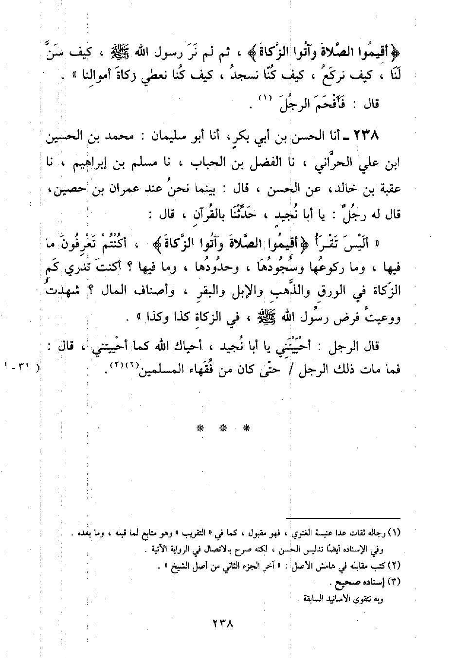 أنا الْحَسَنُ بْنُ أَبِي بَكْرٍ , أنا أَبُو سُلَيْمَانَ , مُحَمَّدُ بْنُ الْحُسَيْنِ بْنِ عَلِيٍّ الْحَرَّانِيُّ , نا الْفَضْلُ بْنُ الْحُبَابِ , نا مُسْلِمُ بْنُ إِبْرَاهِيمَ , نا عُقْبَةُ بْنُ خَالِدٍ , عَنِ الْحَسَنِ , قَالَ: بَيْنَمَا نَحْنُ عِنْدَ عِمْرَانَ بْنِ حُصَيْنٍ قَالَ لَهُ رَجُلٌ: يَا أَبَا نُجَيْدٍ , حَدِّثْنَا بِالْقُرْآنِ , قَالَ: " أَلَيْسَ تَقْرَأُ {أَقِيمُوا الصَّلَاةَ وَآتُوا الزَّكَاةَ} [البقرة: ٤٣] , أَكُنْتُمْ تَعْرِفُونَ مَا فِيهَا , وَمَا رُكُوعُهَا وَسُجُودُهَا , وَحُدُودُهَا , وَمَا فِيهَا؟ أَكُنْتَ تَدْرِي كَمِ الزَّكَاةُ فِي الْوَرِقِ وَالذَّهَبِ وَالْإِبِلِ وَالْبَقَرِ , وَأَصْنَافِ الْمَالِ؟ شَهِدْتَ وَوَعَيْتَ فَرْضَ رَسُولِ اللَّهِ صَلَّى اللهُ عَلَيْهِ وَسَلَّمَ , فِي الزَّكَاةِ كَذَا وَكَذَا " قَالَ الرَّجُلُ: أَحْيَيْتَنِي يَا أَبَا نُجَيْدٍ , أَحْيَاكَ اللَّهُ كَمَا أَحْيَيْتَنِي قَالَ: فَمَا مَاتَ ذَلِكَ الرَّجُلُ حَتَّى كَانَ مِنْ فُقَهَاءِ الْمُسْلِمِينَ